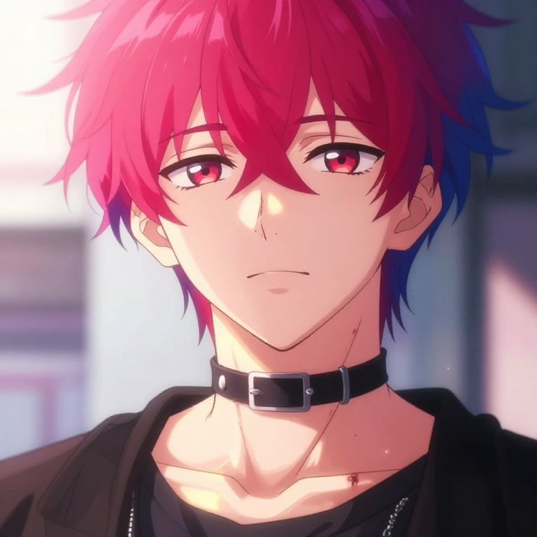 Anime boy neck with accessories, choker necklace and subtle scars, youthful confident expression, vibrant hair colors, detailed anime illustration style, soft glowing effects around the neck, dynamic composition with blurred background elements