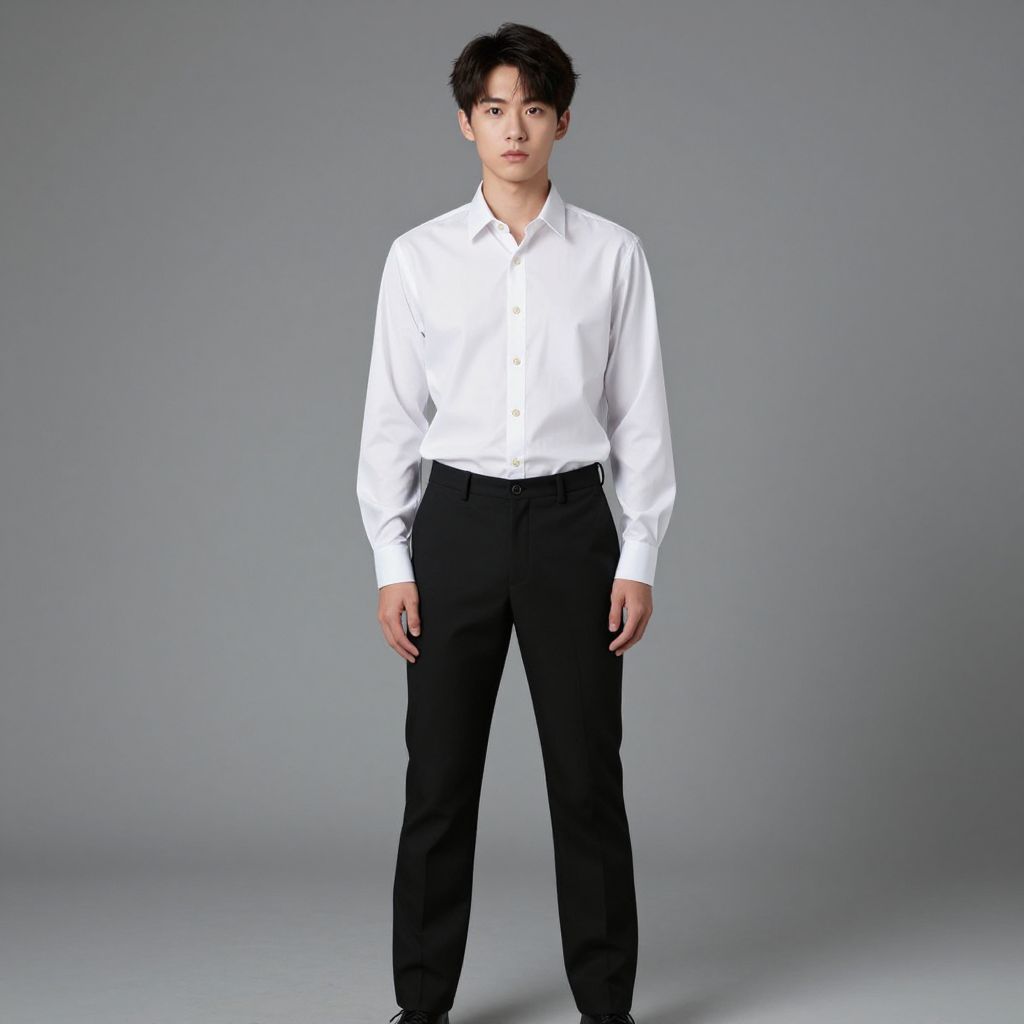 Photograph of an Asian man with short, dark hair, standing against a plain gray background. He is wearing a crisp, white button-down shirt with long sleeves and black trousers. His stance is relaxed, with his hands by his sides and a neutral expression on his face. The lighting is even, highlighting the clean, minimalistic style of the image. The man's skin tone is light, and his build is average. The focus is sharp, with no visible textures or additional objects in the background.