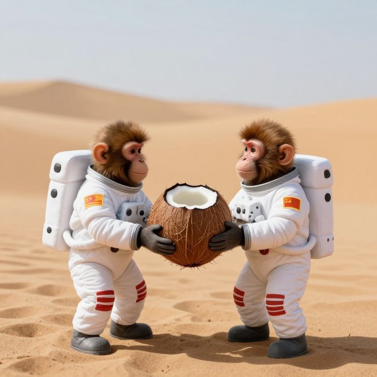 In a surreal desert expanse, two monkeys in miniature astronaut suits embark on a whimsical mission, their hands cradling a colossal coconut like a cosmic artifact, symbolizing the boundless curiosity and playful ingenuity of exploration amidst the vastness of the unknown.