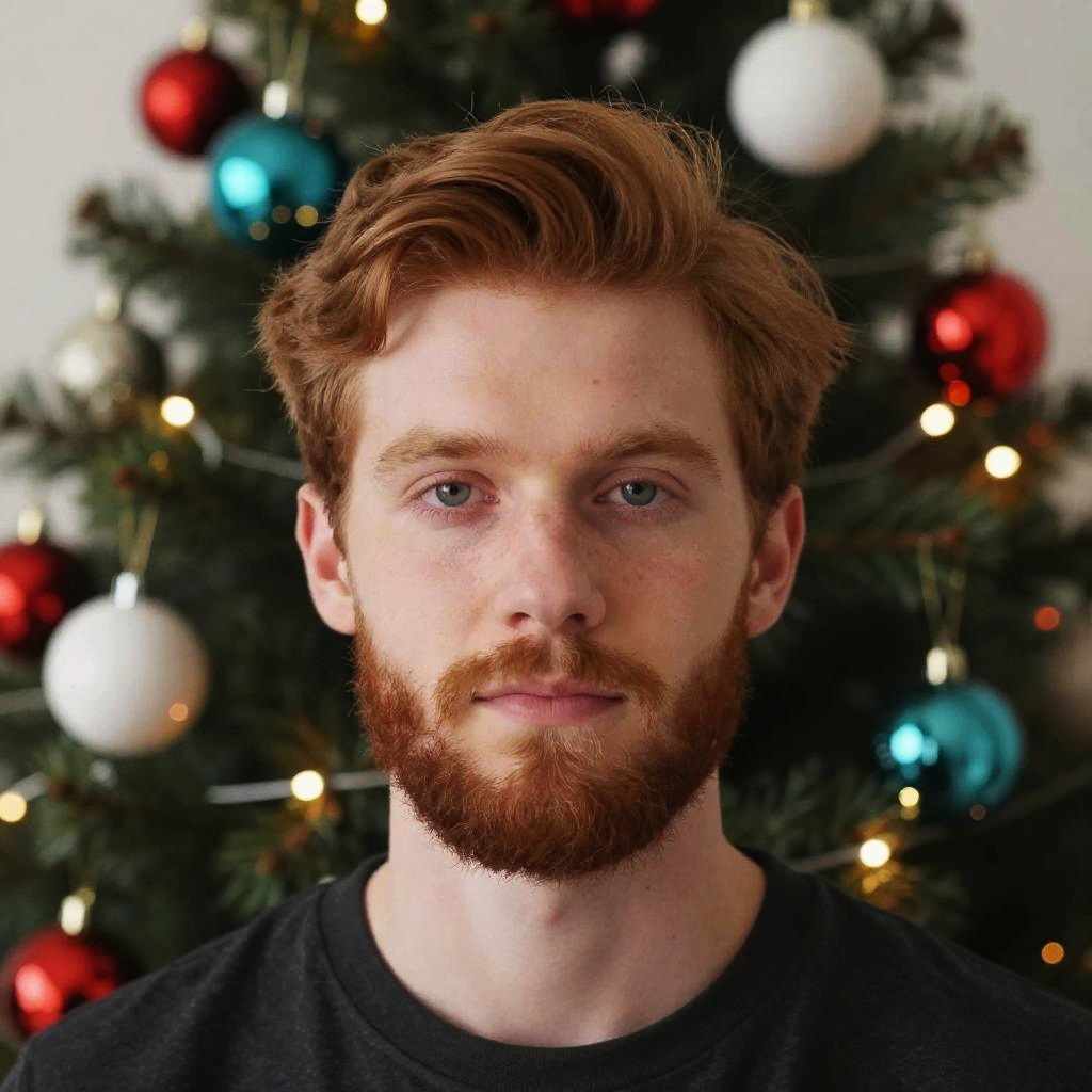 A young man with a neatly groomed beard and reddish-brown hair poses in front of a festively decorated Christmas tree adorned with red, white, and turquoise ornaments and glowing lights. The close-up portrait captures a warm and calm expression, set against a softly blurred holiday background.