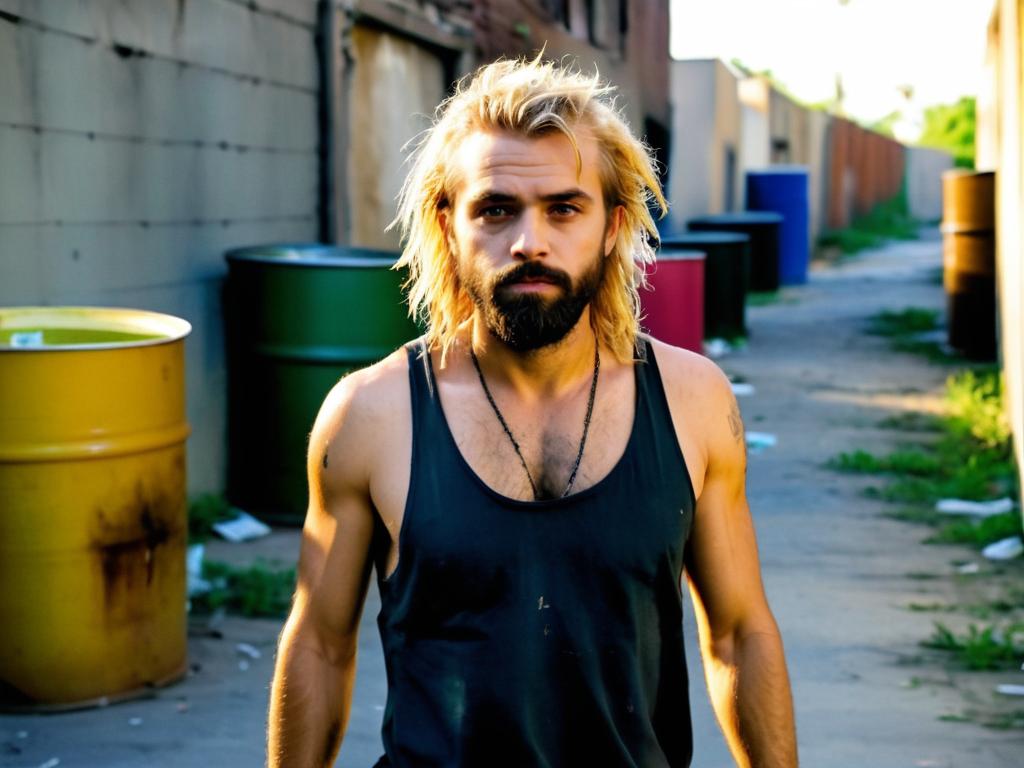 A photo of a disheveled man, messy blonde hair, clear eyes, thick beard, messy, shirtless, meth head, crack head, back alley, grungy, scars, trash barrels