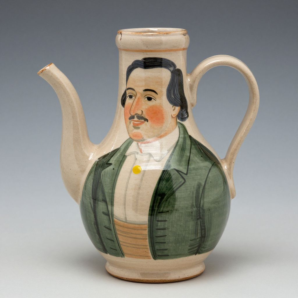 Hand-painted ceramic teapot with a caricatured man in a green suit and mustache, featuring a spout and handle, set against a