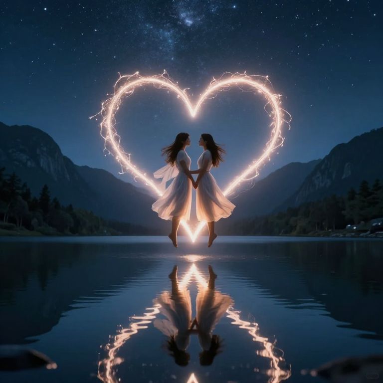 Digital artwork of two women with long, flowing brown hair, standing on a reflective lake at night, facing each other. They are silhouetted in white dresses, holding hands, and creating a heart shape with glowing, spark-like lights above them. The night sky is dark blue with stars and the Milky Way visible. Surrounding the lake are dark, mountainous terrain. The women's reflections are mirrored in the calm lake water. The scene has a magical, romantic atmosphere.