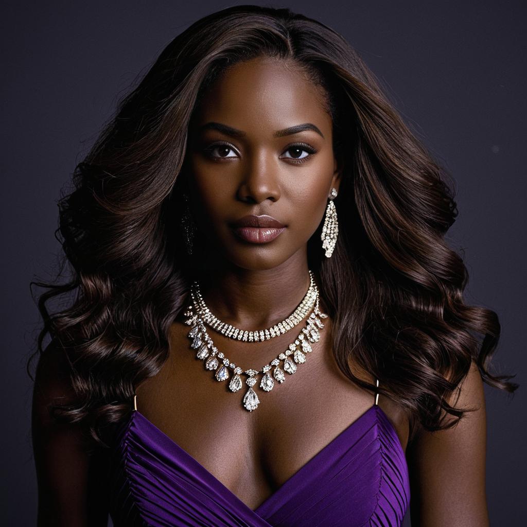 Portrait of an elegant African American woman with long, wavy brown hair, wearing a purple dress. She is adorned with sparkling diamond necklace and matching earrings, looking confidently at the viewer against a dark background.
