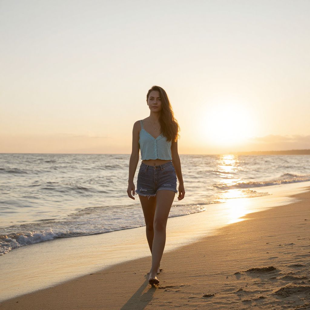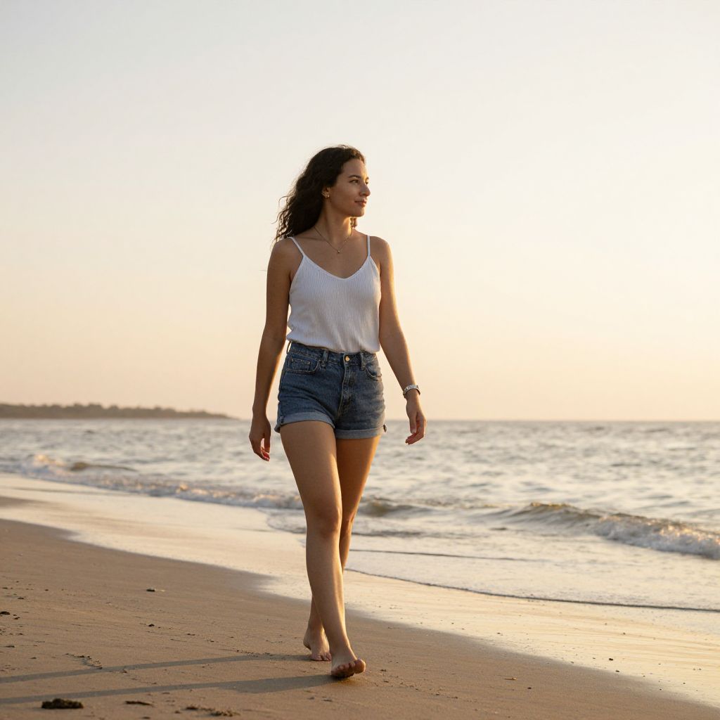 Photograph of a young woman with light brown skin and curly dark brown hair walking barefoot on a sandy beach at sunset. She wears a white, sleeveless, spaghetti-strap tank top and high-waisted, blue denim shorts. Her arms are relaxed by her sides, and she gazes to her left. The background features a calm ocean with gentle waves and a blurred horizon under a soft, golden sky. The sunlight creates a warm glow, casting long shadows on the sand. The overall mood is serene and carefree.