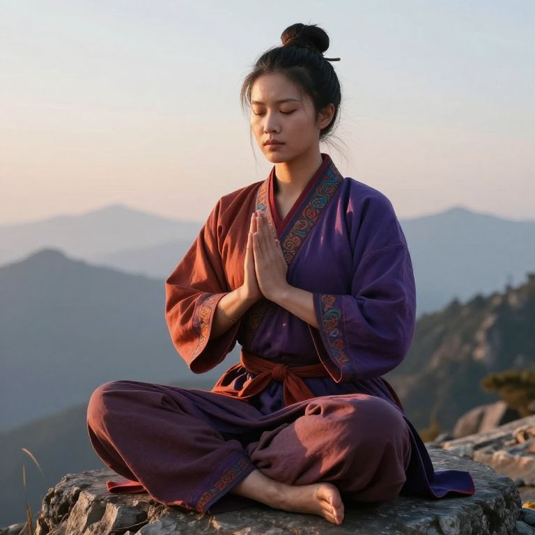 Asian woman in purple traditional kimono meditates on mountain ledge at sunset, hands in prayer position, eyes closed, serene expression.