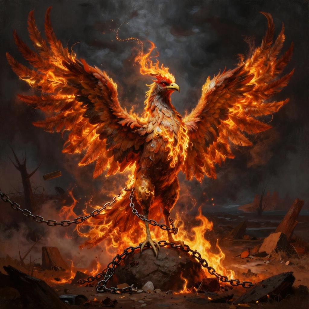 Digital painting of a majestic phoenix with fiery orange and red feathers, standing on a rocky pedestal engulfed in flames. The phoenix's wings are outstretched, displaying intense, glowing flames. A chain binds its legs to the rock. The background is a dark, smoky landscape with scattered debris and charred trees, creating a dramatic, apocalyptic atmosphere. The phoenix's eyes are fierce and focused, adding to the powerful, mythical representation. The image is highly detailed, with vibrant colors and dynamic lighting.