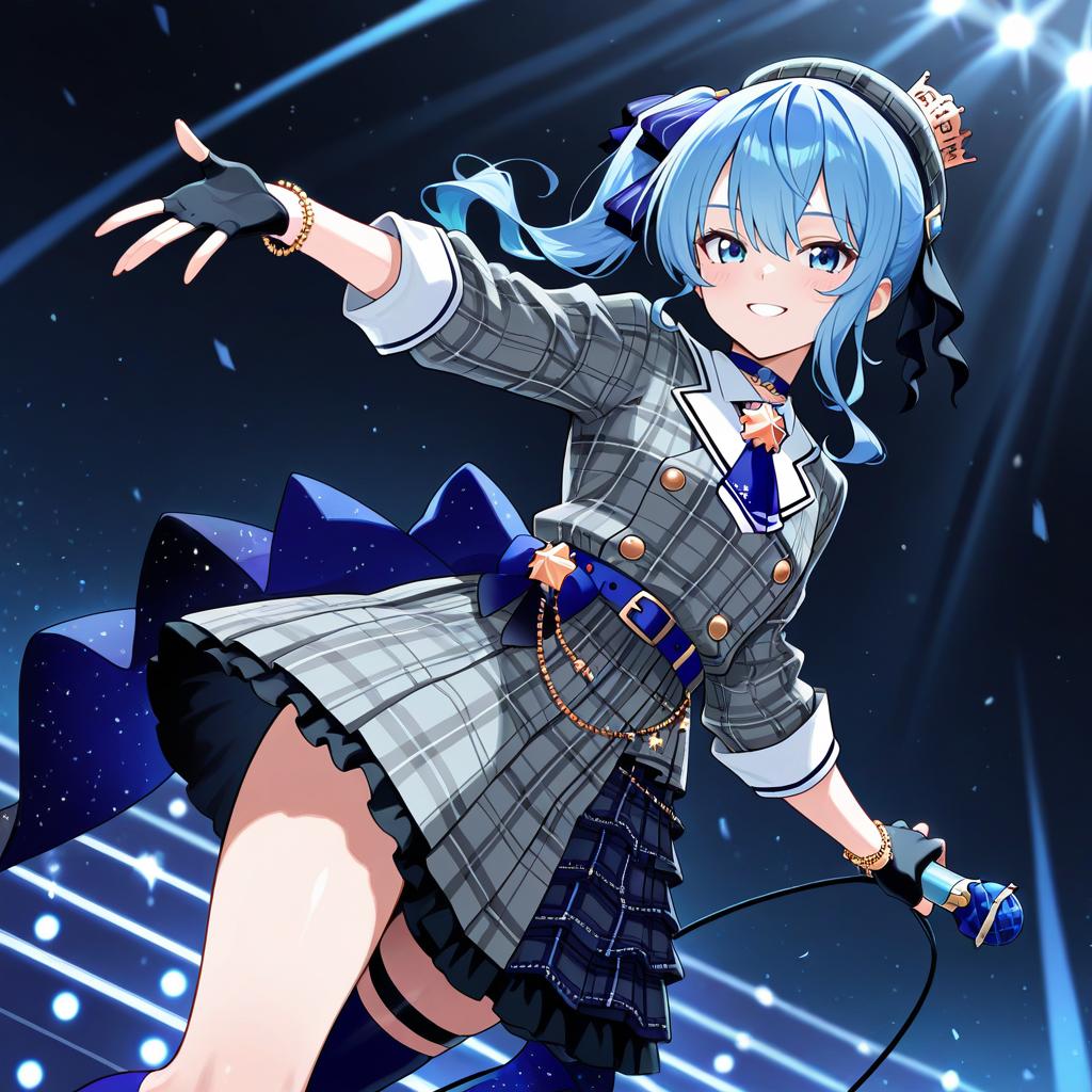 Masterpiece, best quality, highres, sui1, 1girl, solo, side ponytail, hoshimachi suisei, fingerless gloves, single thighhigh, jewelry, single sock, thigh strap, bracelet, blue socks, buttons, single kneehigh, plaid dress, blue choker, blue belt, plaid skirt, mini crown, grey skirt, blue ascot, long sleeves, plaid jacket, cowboy shot, on the stage, holding microphone, smile