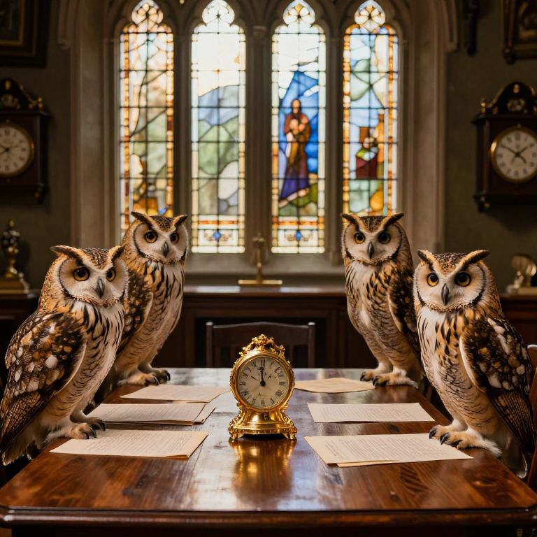 Owls perch solemnly around a polished wooden table in an ornate chamber, their piercing eyes fixed on documents as golden clocks tick above, casting a warm glow through stained glass windows.