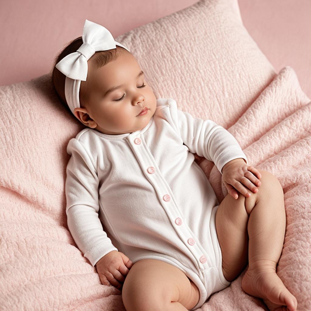 Newborn sleeping suit, photorealistic, baby sleeping, white onesie with buttons, white bow headband, light pink soft fabric background, realistic ures, high detail, top-down view, peaceful expression, baby's arms and legs relaxed, soft lighting, realistic skin tones, photorealistic CGI, T2I style