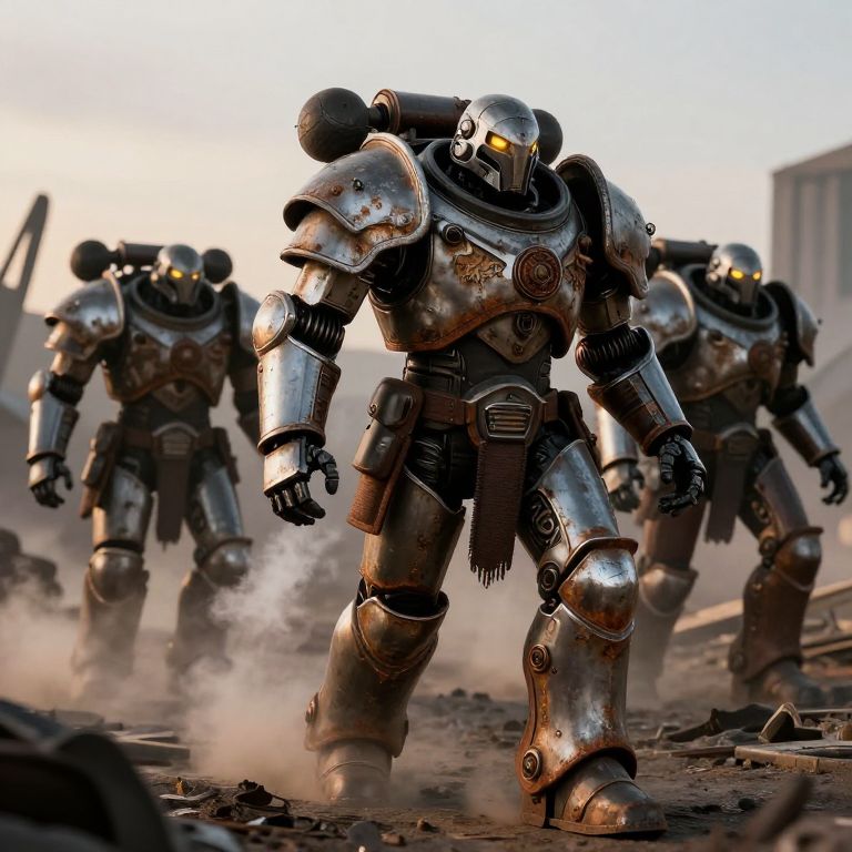 Warforges marching through a post-apocalyptic wasteland, battle-scarred and weathered, armor combining rusted iron and polished steel plates, with fierce glowing eyes, mechanical limbs emitting steam, emphasizing their relentless nature in dusk light