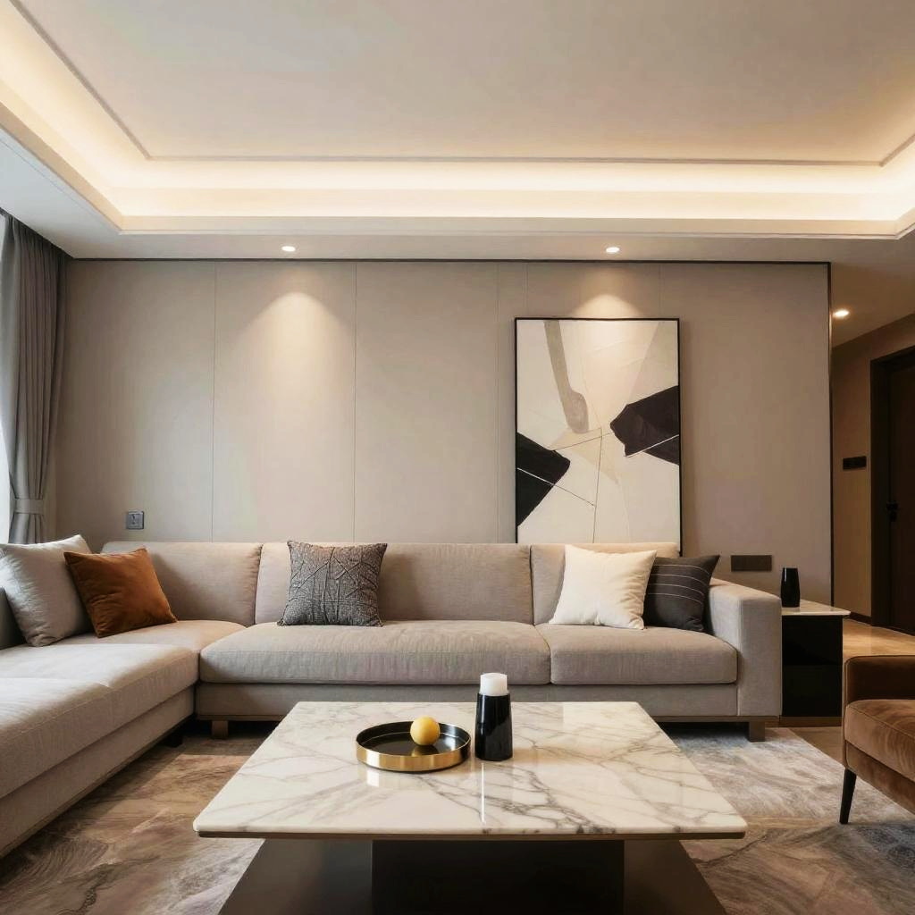 Bougie interior design of a modern living room, combining minimalism and luxury with marble surfaces, designer furniture, large abstract art pieces on walls, ambient lighting highlighting textures and rich materials, cozy yet polished.
