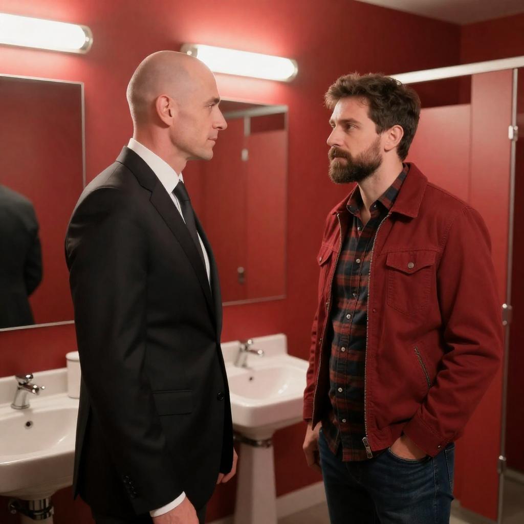Photograph of two men in a brightly lit bathroom with red walls. Bald man in black suit faces bearded man in red jacket and plaid shirt. Both stand facing each other, mid-conversation. White sinks and mirrors in background.