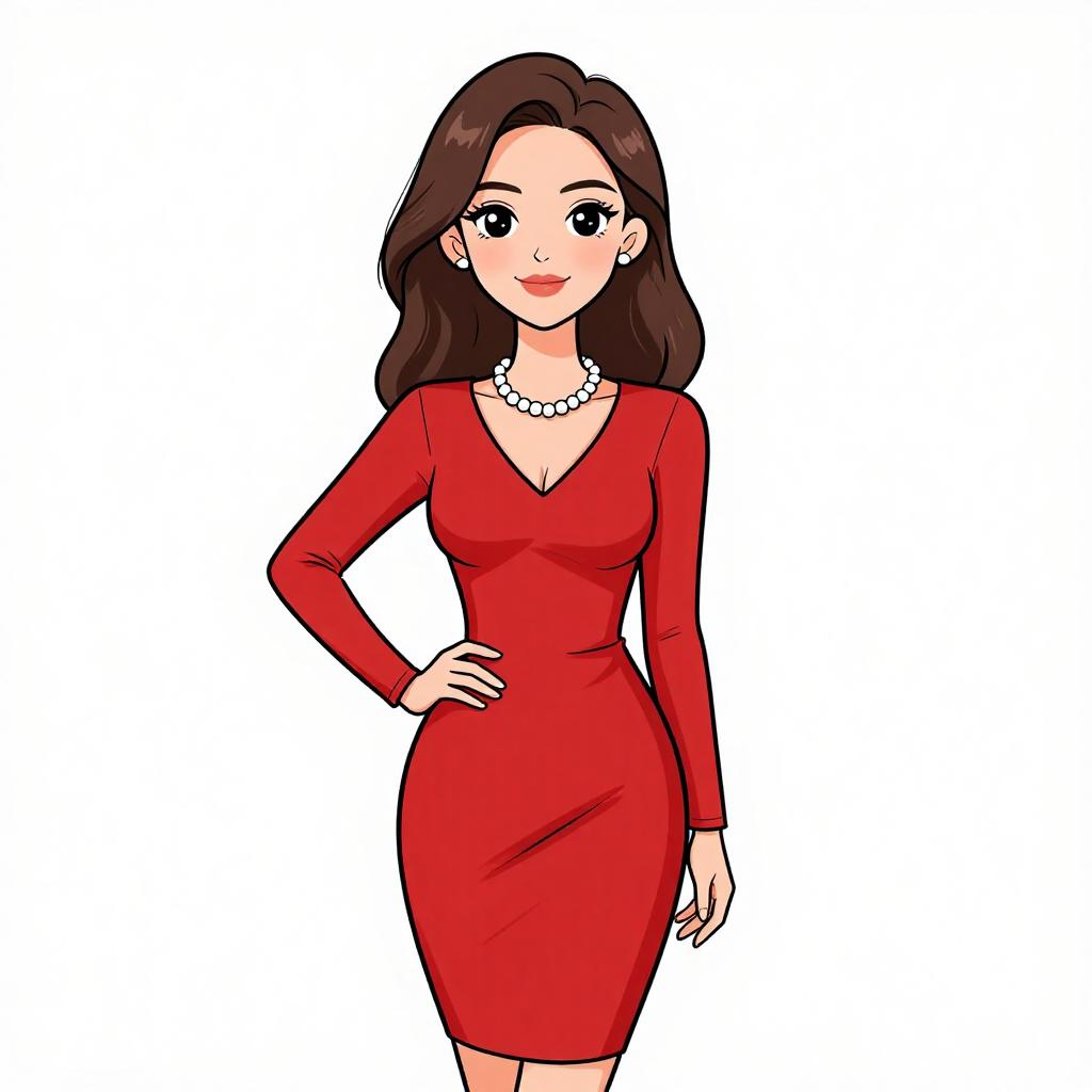 Woman with pretty face and pretty hair. smiling Woman, casual chic, solid burgundy shift dress, knee-length, scoop neckline, three-quarter sleeves with button tabs, no visible print or pattern, paired with a statement chunky necklace with geometric shapes. --sref 1467