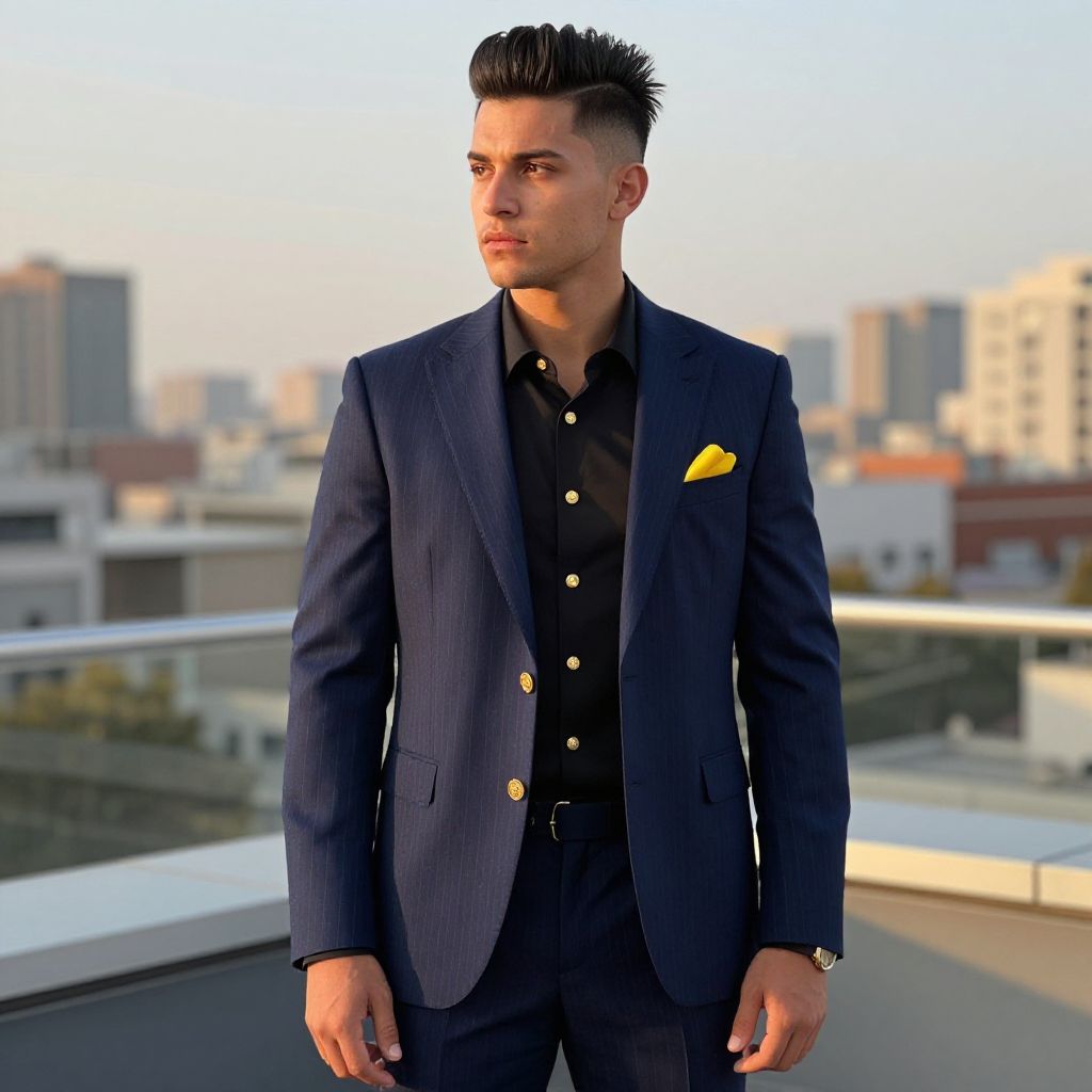 Portrait of a stylish young man with a pompadour fade hairstyle standing on a rooftop terrace during golden hour. He wears a navy blue pinstripe suit with a black shirt accented by gold buttons, and a yellow pocket square. The city skyline is visible in the background, creating a sophisticated urban atmosphere.