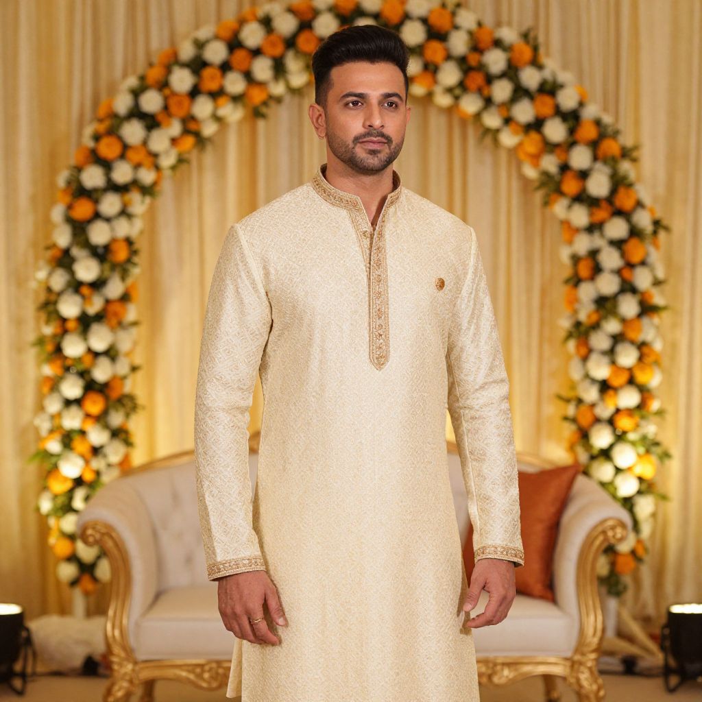 Bollywood Theme Party Costume, man in traditional indian attire standing in front of a floral arrangement