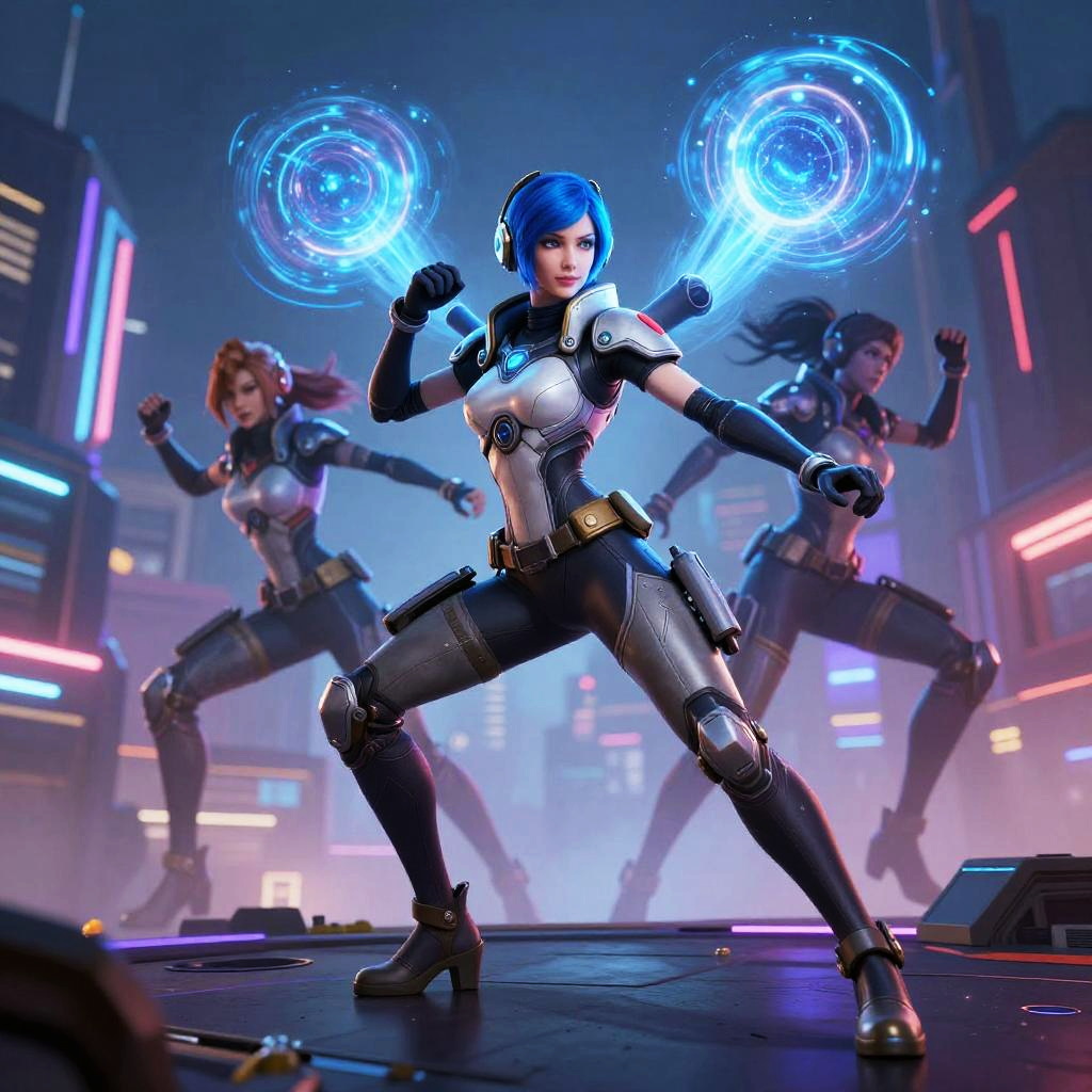 A vibrant, CGI-rendered image of three female warriors in a futuristic, neon-lit cityscape. The central figure, with striking blue bob-cut hair, is in a powerful stance, emitting glowing blue energy orbs from her hands. She wears a silver and black, form-fitting tactical suit with knee pads and high boots. Her physique is athletic, with medium-sized breasts. Two other women, with red and black hair, mirror her stance in the background. Neon lights in pink, blue, and purple hues illuminate the scene, adding a dynamic, cyberpunk atmosphere. The characters' expressions are intense and focused.