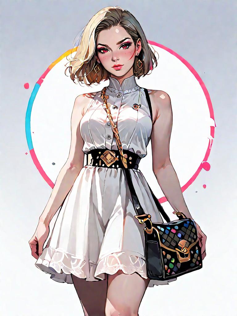 1girl, source_comics, realistic face, full body shot, Woman, minimalist, mid-length A-line dress in pale grey, halter neckline, sleeveless, fitted waist with tie belt, flowing skirt, paired with open-toe heeled sandals in light beige, studio background.
