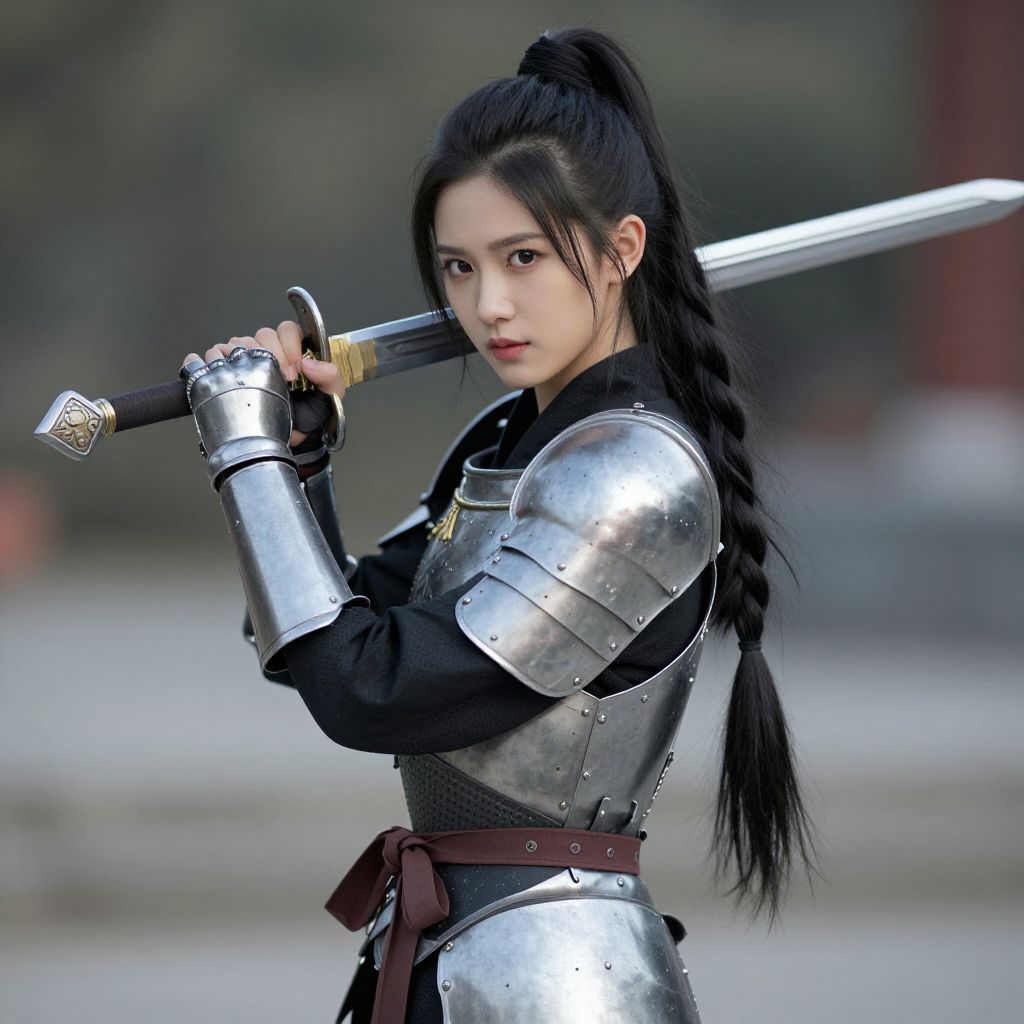 Adult female warrior costume, 1girl, solo, armor, weapon, sword, black hair, looking at viewer, long hair, braid, ponytail, blurry background, holding, blurry