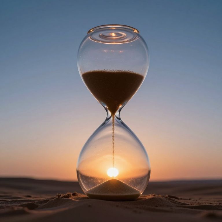 Suspended above a vast desert landscape, a luminous hourglass glows with cascading sand, its ethereal form contrasting against the twilight sky and setting sun below.