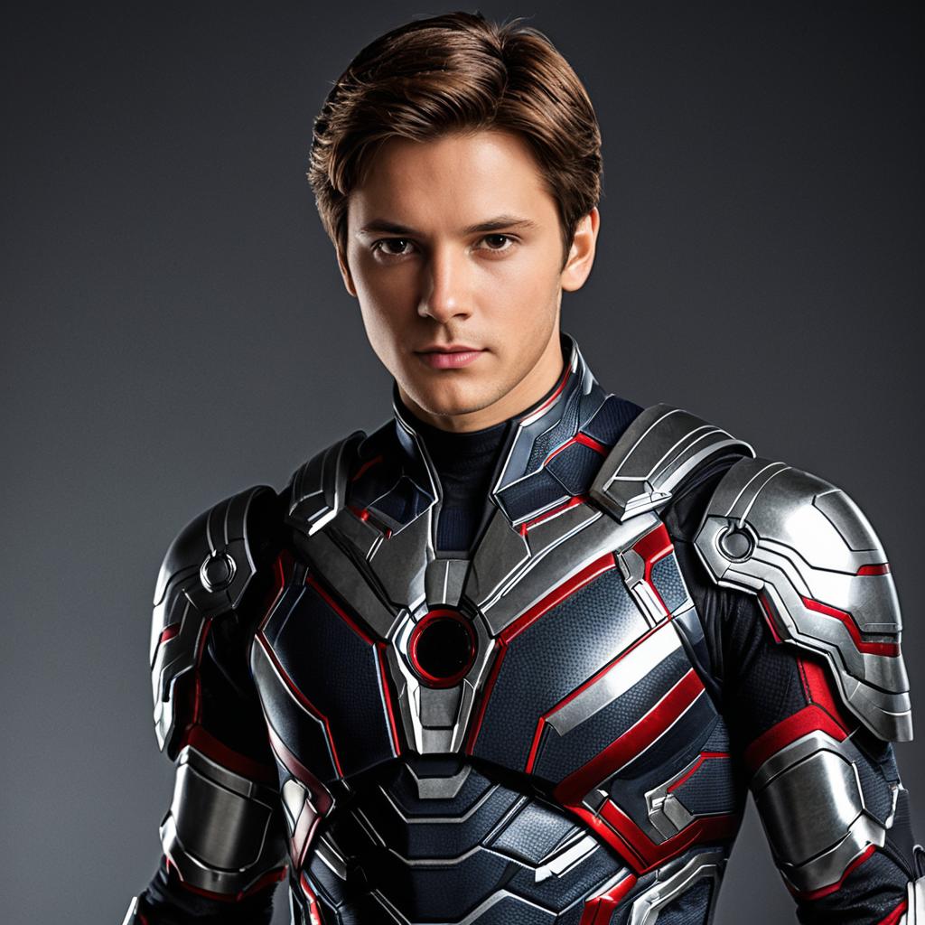 Portrait of a young man with brown hair wearing a realistic green Star Trek replica costume shirt with long sleeves, indoors. He has a serious expression, looking directly at the viewer with a closed mouth. The background shows a neutral interior setting with muted gray walls and furniture.