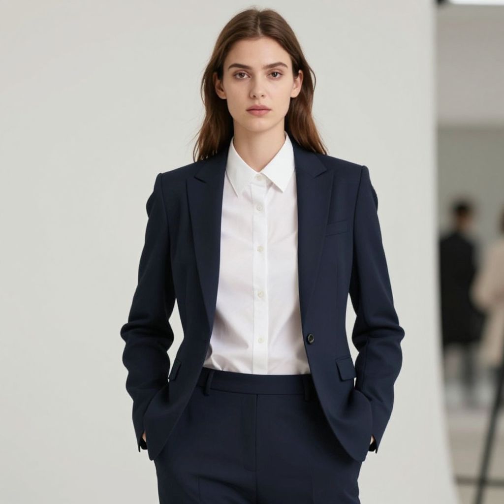 Photograph of a young woman with fair skin and long, straight brown hair, standing confidently against a white background. She is wearing a dark navy blue suit with a white dress shirt, hands in her pockets. The suit is tailored, with a fitted jacket and high-waisted trousers. Her expression is neutral, with slightly parted lips and direct eye contact with the camera. The background is blurred, showing indistinct shapes and a faintly visible person in the distance, adding depth to the image. The overall style is minimalist and modern.