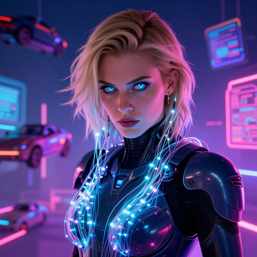 Blonde AI model in a neon-lit cyberpunk environment, wearing futuristic armor interlaced with glowing fiber optic cables, intense gaze with electric blue eyes, background bustling with flying cars and holograms, vibrant palette with deep shadows, ultra-realistic digital painting.
