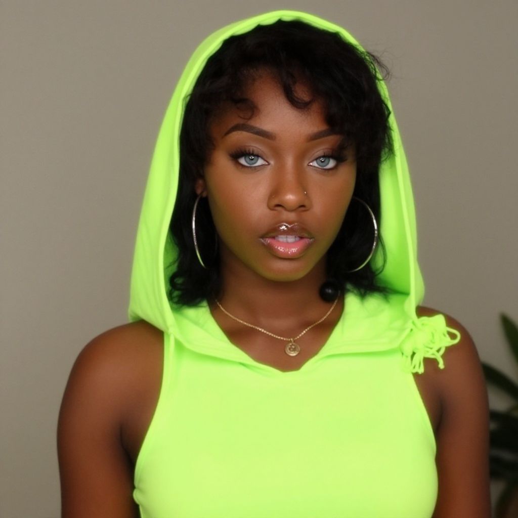 Photograph of a beautiful Black woman with bright blue eyes, wearing a neon green hooded top, large hoop earrings, and a nose ring, against