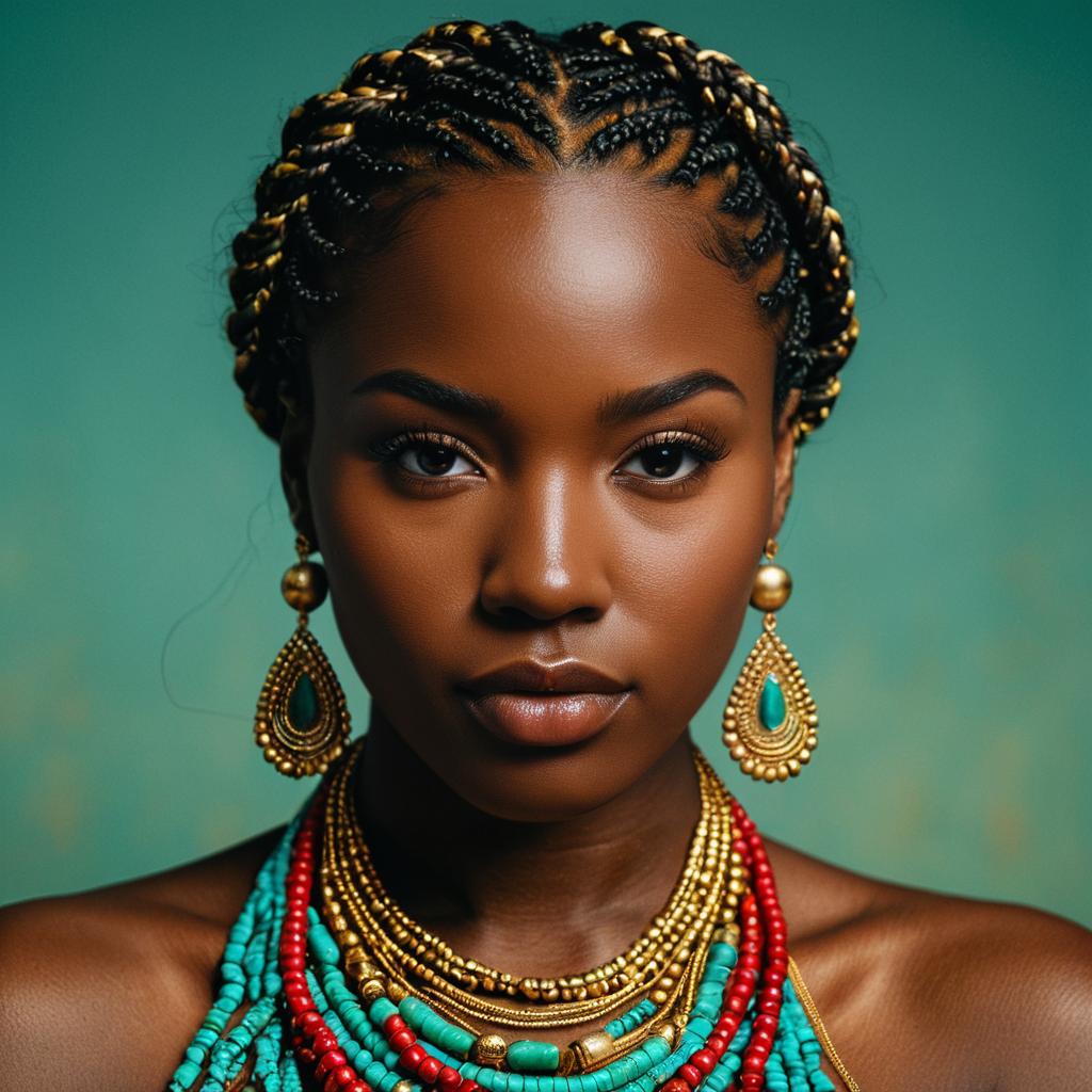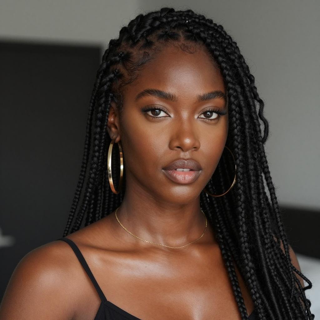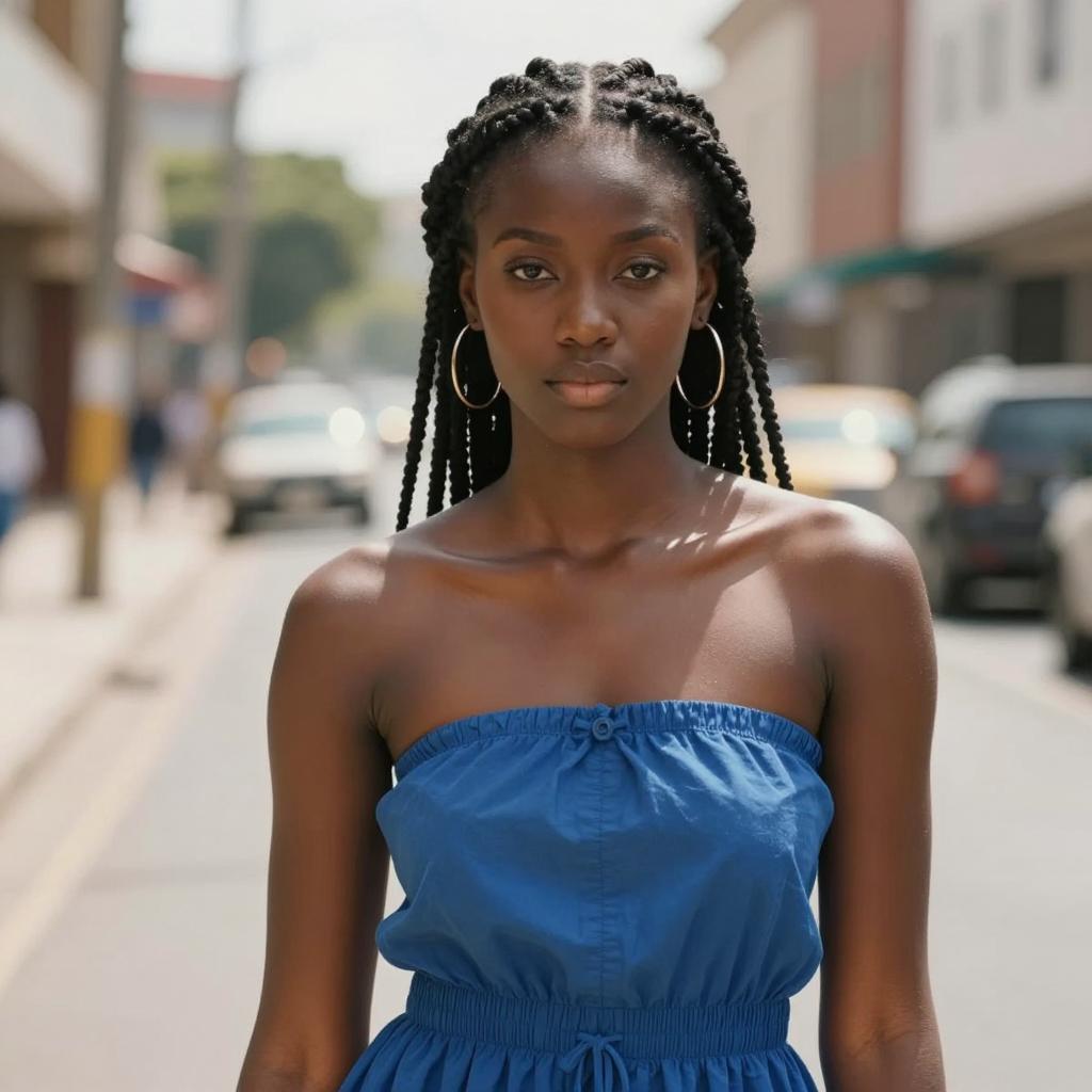 Ponytail hairstyle african, photograph of beautiful Black woman, dark skin, long twisted high ponytail, wearing black strapless dress, gold hoop earrings, gold necklace, serious expression, background blurred garden with colorful flowers, daytime, natural light, realistic style, close-up, portrait, outdoor setting