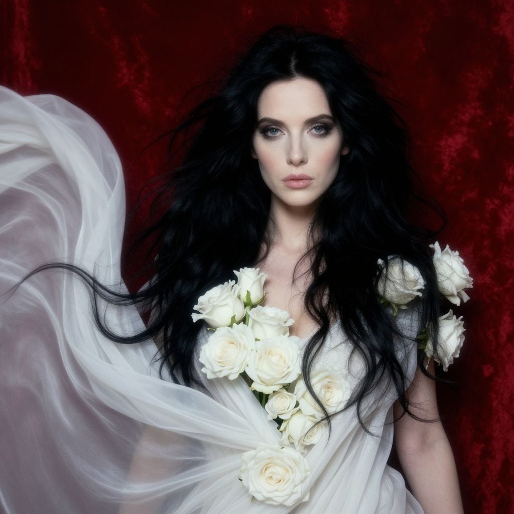 Portrait of kate bush against a red velvet background, lush black hair, pale skin, white roses, flowing material, intricate, beautiful cinematic lighting, stuning painting by artgerm and android jones