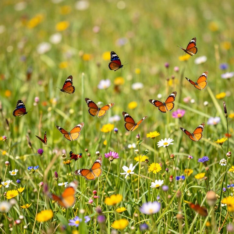 Fifty unique butterflies fluttering over a blooming meadow filled with wildflowers, bright sunlight casting dynamic shadows, vivid colors, highly detailed nature scene, soft focus background