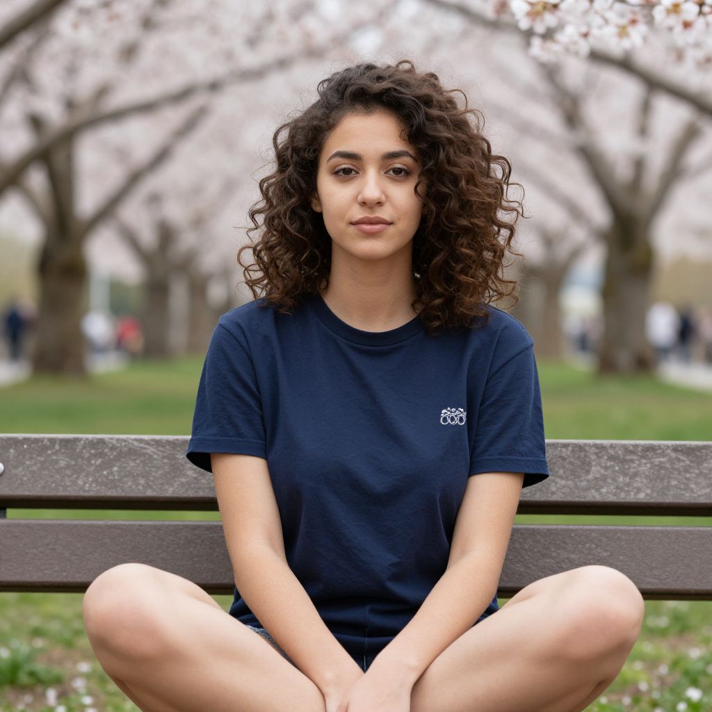 A candid moment of a young woman with curly black hair and a bright smile wearing a chunky orange and black geometric scarf tied loosely around her neck, sitting on a park bench in the early spring, with blooming cherry trees and soft green grass in the background, capturing a relaxed, everyday vibe.