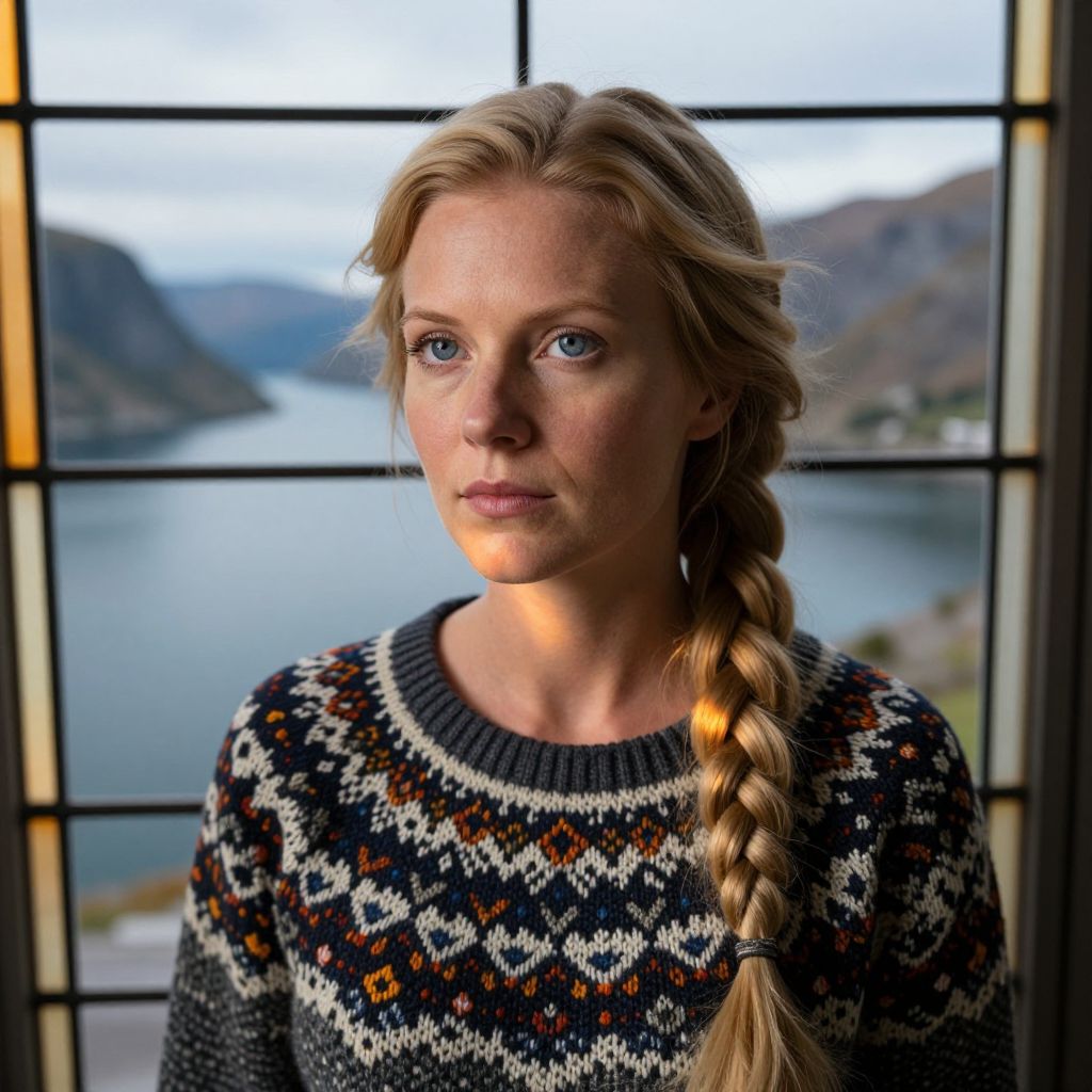 A photorealistic portrait photograph presents a European woman with striking blue eyes and long, braided golden hair from an overhead perspective reminiscent of Baroque art. Her serene expression shines through, illuminated by soft, warm light filtering through a stained-glass window, casting vibrant hues across her stoic features and intricate Icelandic sweater patterns. Standing amidst a tranquil fjord landscape, the gentle interplay of light and shadow on her fair skin evokes deep tranquility and introspection. This captivating portrait seamlessly blends ultrarealistic detail with an ethereal, timeless quality, inviting viewers to explore its transparent depths.
