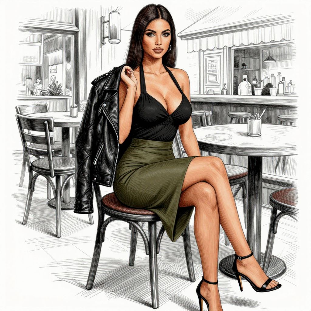 Digital illustration of a stylish woman with long, straight black hair, fair skin, and full red lips, sitting on a chair in a café. She wears a black, low-cut, sleeveless top revealing ample cleavage, a green, high-waisted, knee-length skirt, and black high heels. She holds a black leather jacket over her shoulder. The background features a sketch-style café with round tables, chairs, and a counter with coffee machines. The image combines bold, colored elements with monochrome sketch details, creating a striking contrast.