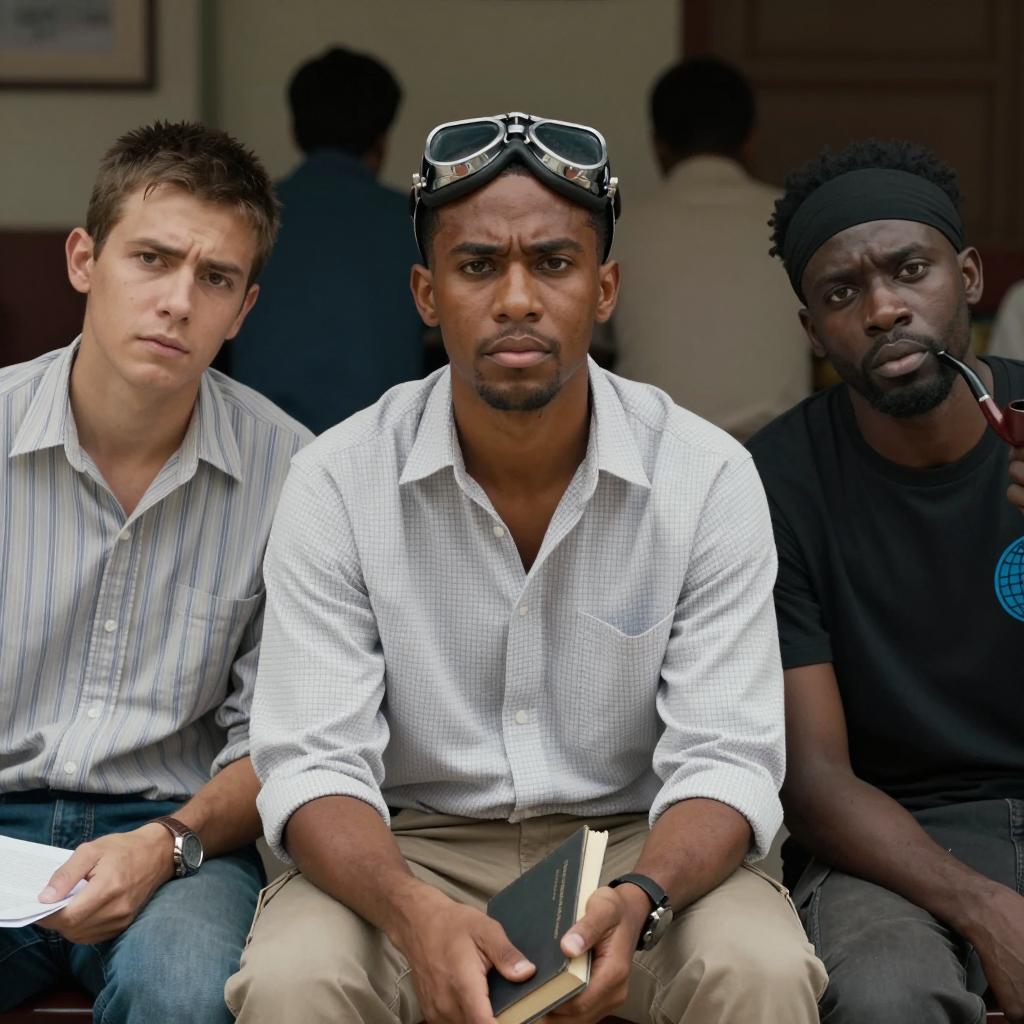 Three men sitting closely together. Central man with light brown skin, short hair, goggles on head, white checkered shirt, holding a book. Left man with light brown skin, short hair, striped shirt, holding a paper. Right man with dark brown skin, headband, black shirt with blue globe emblem, holding a pipe. All have intense expressions. Background includes dim lighting, indistinct figures.