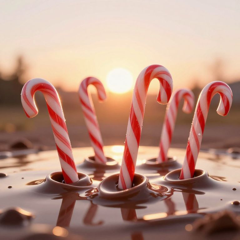Sentient candy-cane spoons stand upright in a glossy chocolate expanse, their striped handles gleaming under the warm glow of a setting sun, creating a surreal and whimsical scene.