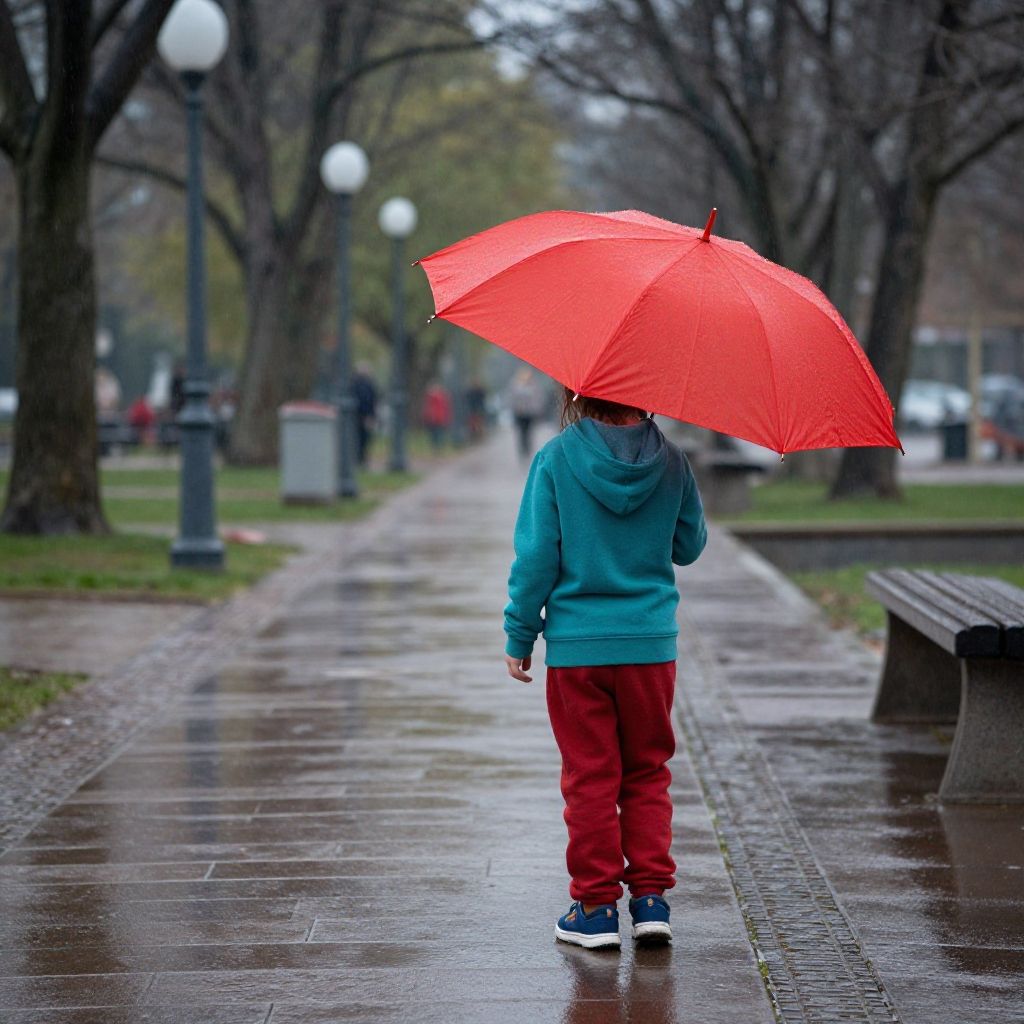 A young child wearing a teal hoodie and red pants stands on a wet park pathway, holding a bright red umbrella. The scene captures a rainy day with blurred trees, street lamps, and benches in the background, creating a serene urban park atmosphere.
