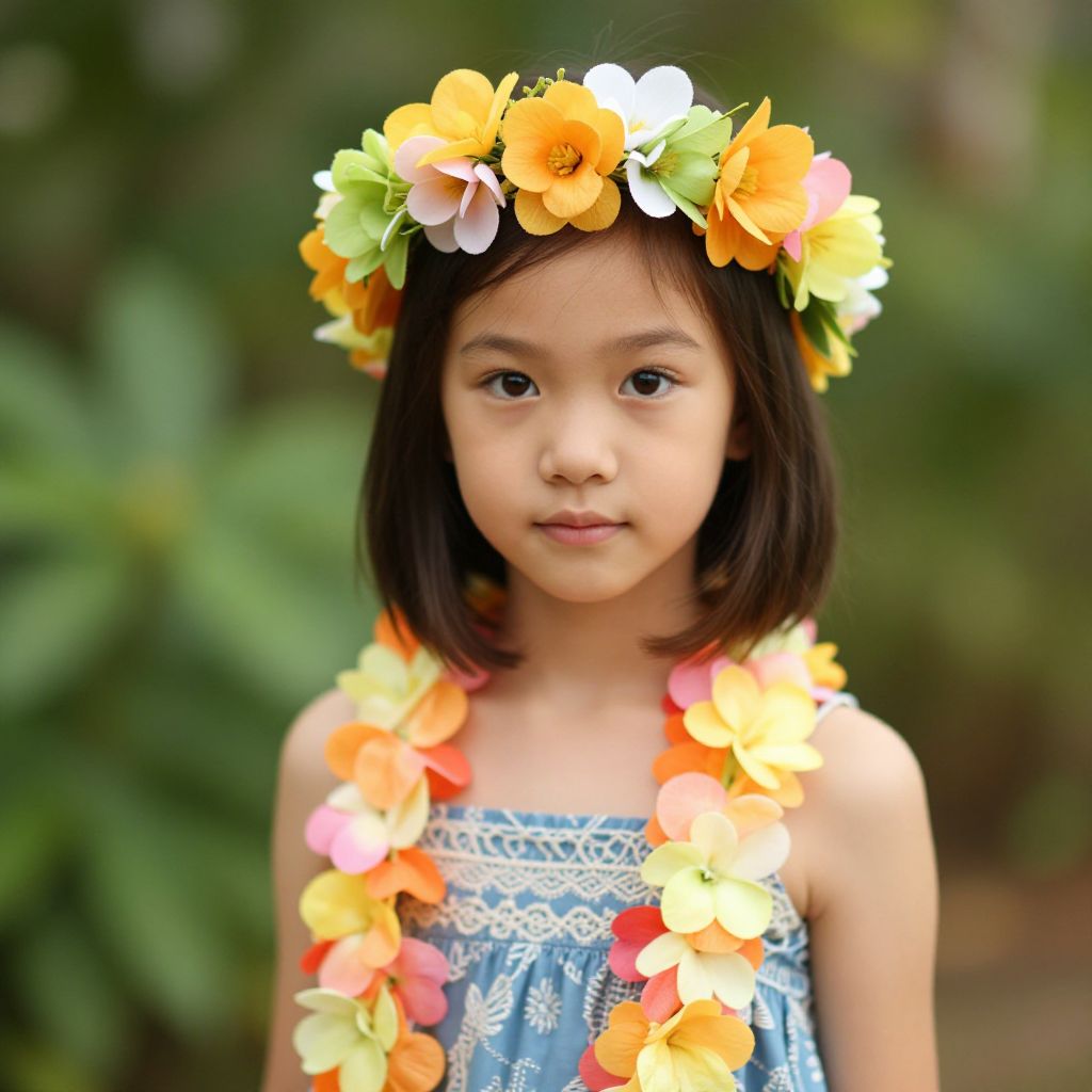 Photograph of an Asian girl with shoulder-length black hair, wearing a colorful flower crown and lei, in a blue lace dress, against a blurred green