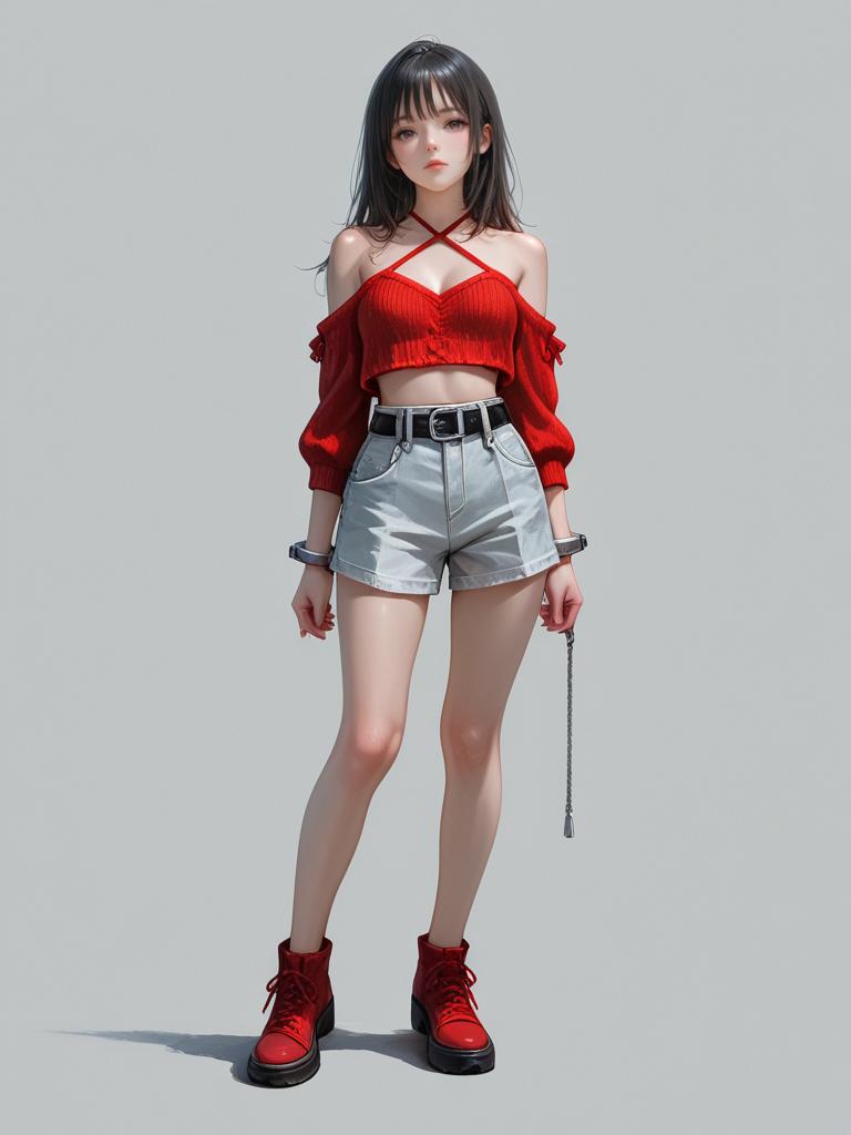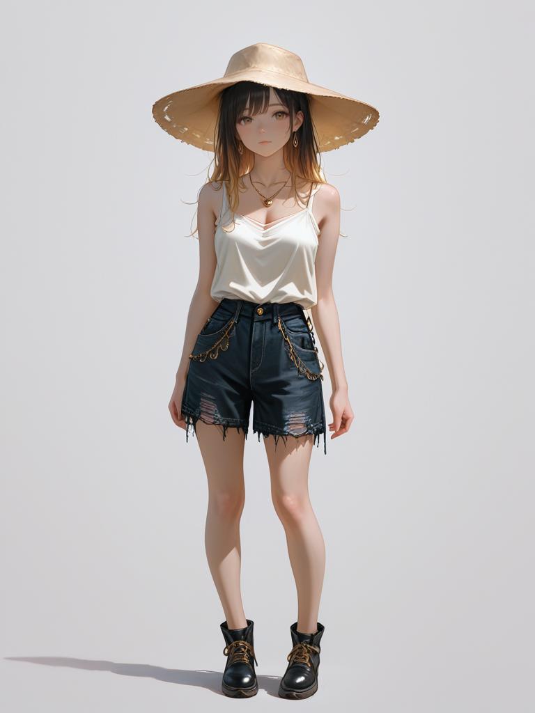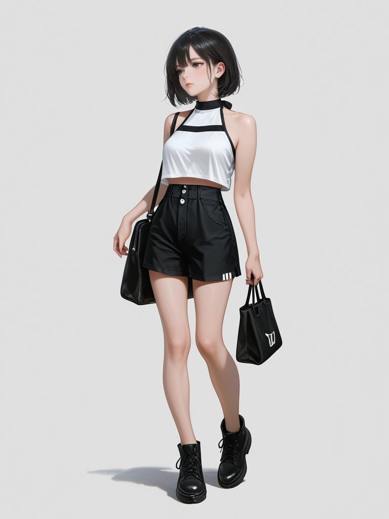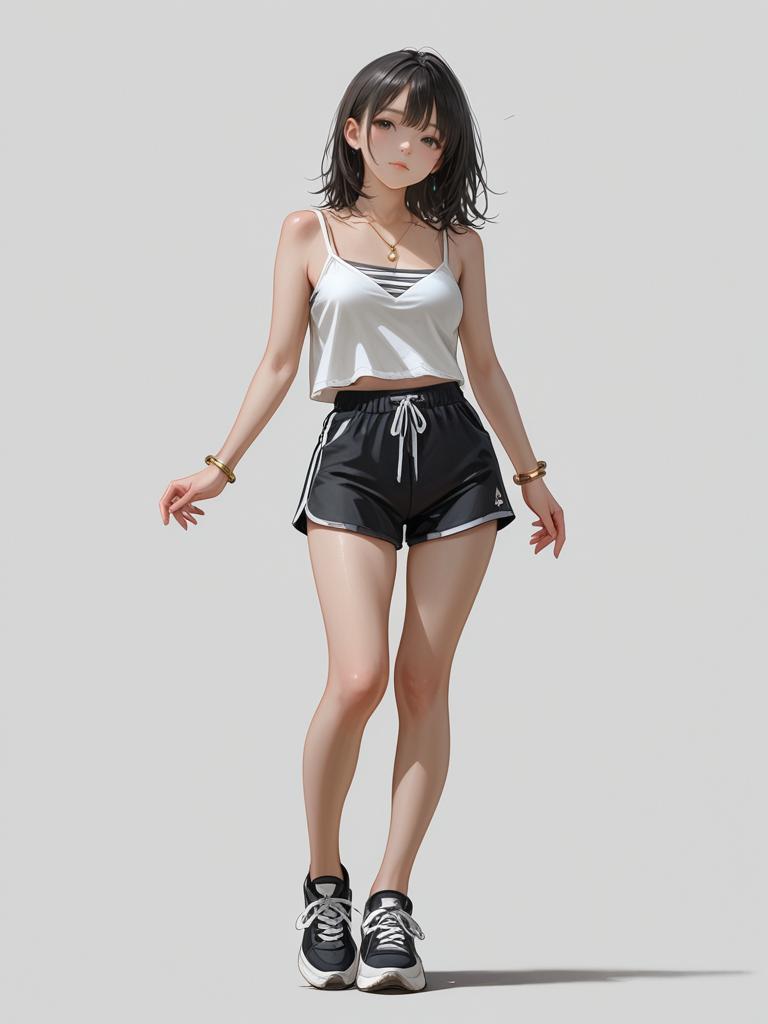 1girl, realistic face, full body shot, Woman, casual sporty, white cropped tank top, scoop neckline, matching white drawstring shorts with a gray striped accent on the sides, minimalist gold bangle on the wrist, white background.