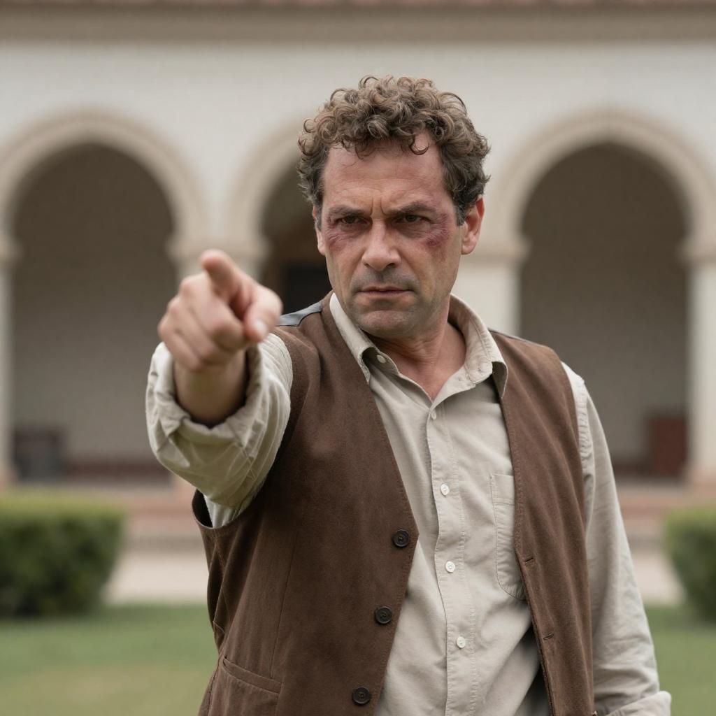 Photograph of a middle-aged man with graying hair and beard, wearing a beige shirt, olive green t-shirt, and gray vest. He has a serious expression, a necklace with a seashell pendant, and a brown stain on his shirt. Background includes blurred greenery and stone structures. His vest has pockets. He stands in the center, looking directly at the camera.