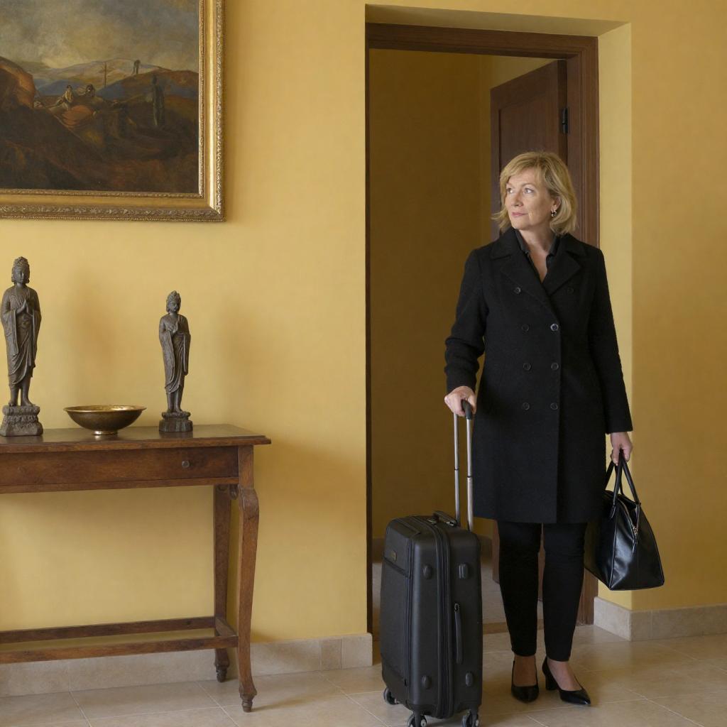 Middle-aged woman with short blonde hair, dressed in a black coat and black pants, standing in a doorway pulling a black suitcase with one hand and holding a black handbag with the other. She is indoors with yellow walls and a tiled floor. To her left is a wooden side table featuring two small statues and a brass bowl, beneath a framed painting.