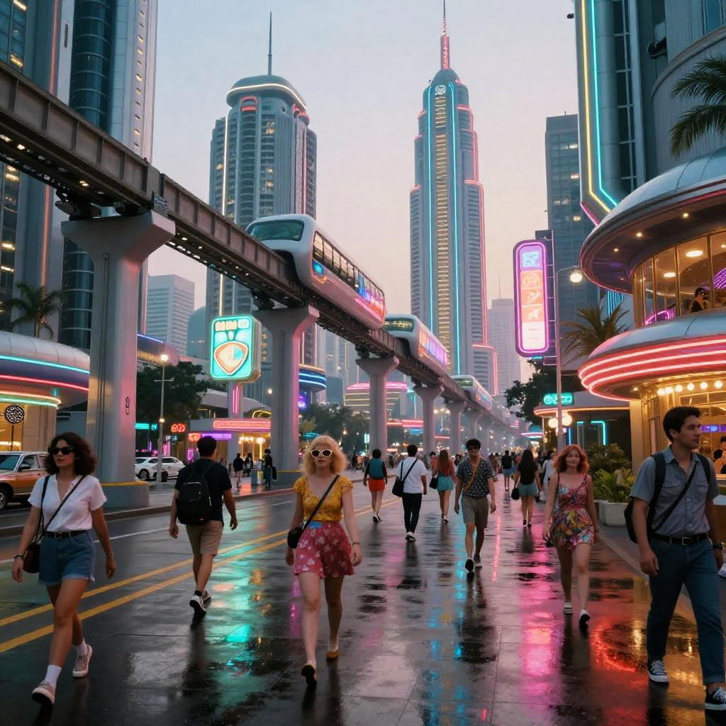 Atompunk city bustling with activity, a blend of mid-century modern design and futuristic technology, monorails weaving between streamlined towers, citizens in retro-futuristic attire, glowing neon signs reflecting on wet pavement, rich in color and atmosphere.