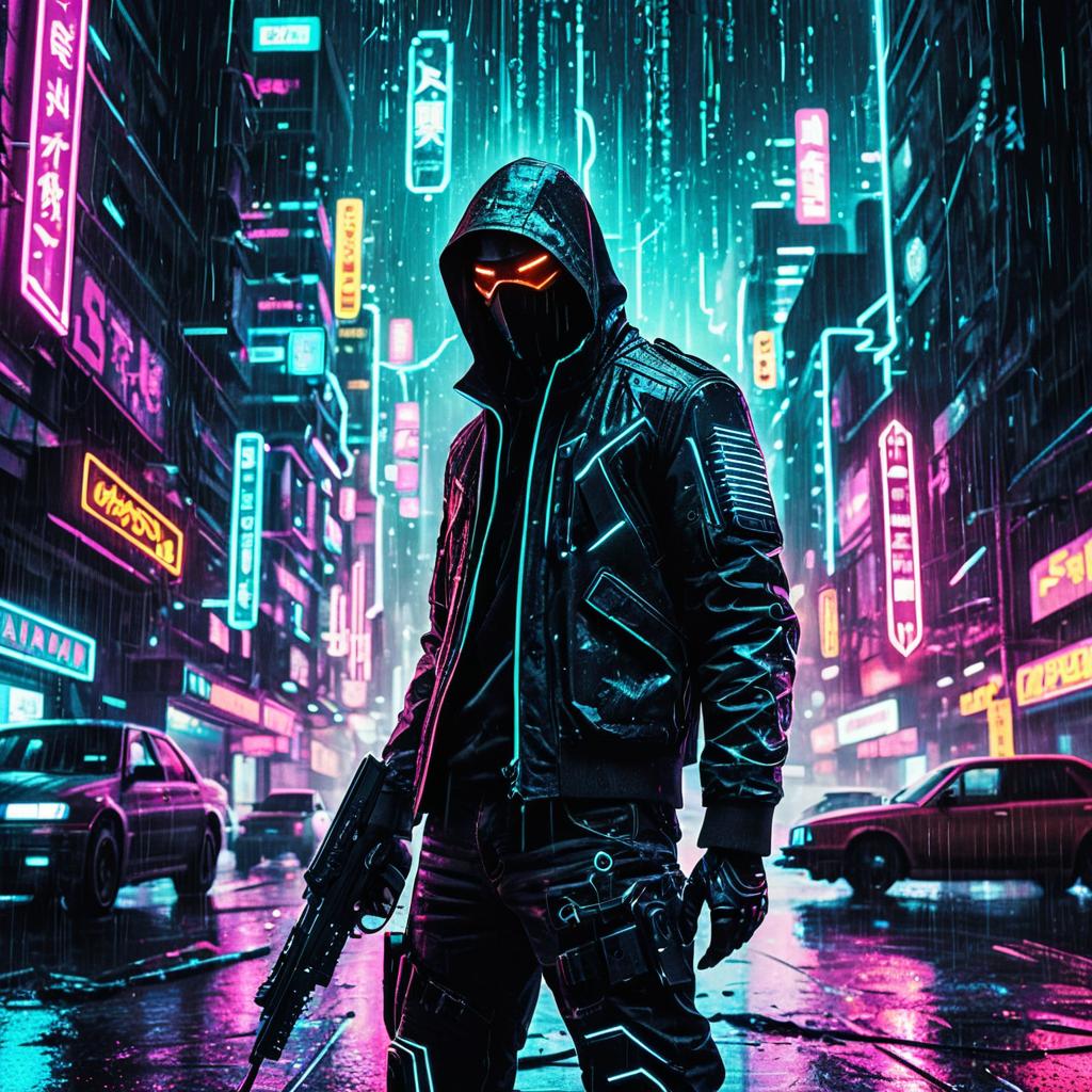 Cyberpunk Male Android Mercenary in Rainy Neon City