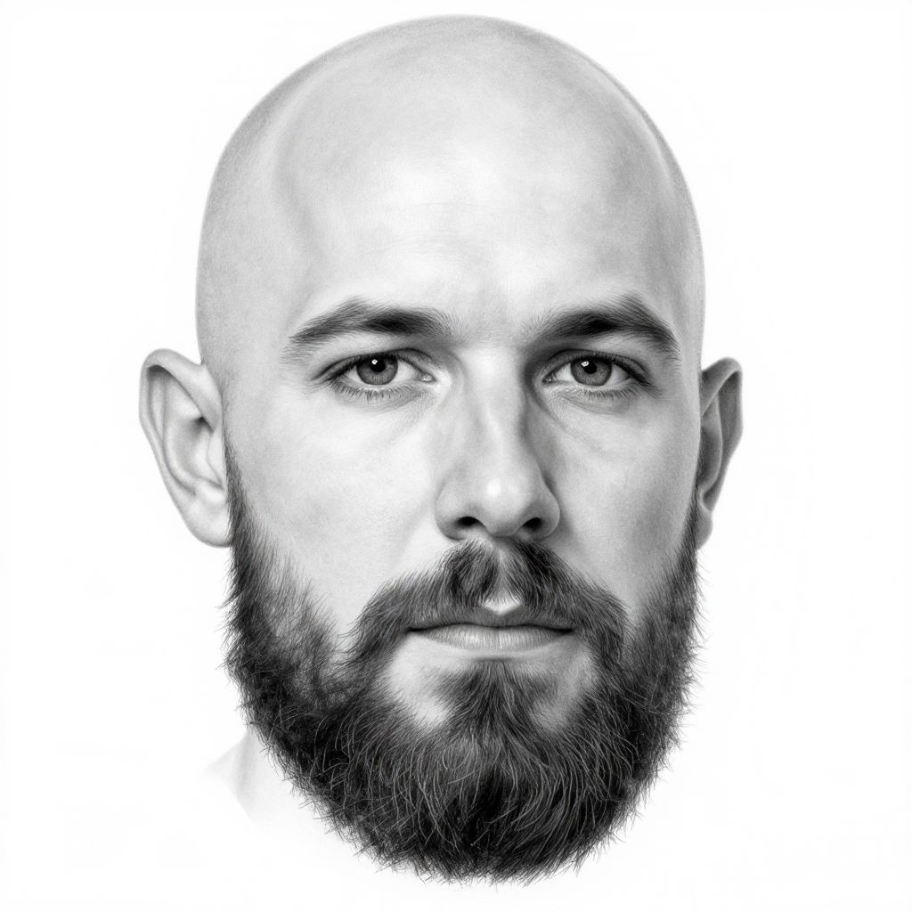 Artistic bald filter on a male subject with expressive eyes, studio lighting, monochrome color palette, sharp contrast, textured skin, elegant and minimal composition, ultra realistic digital painting.
