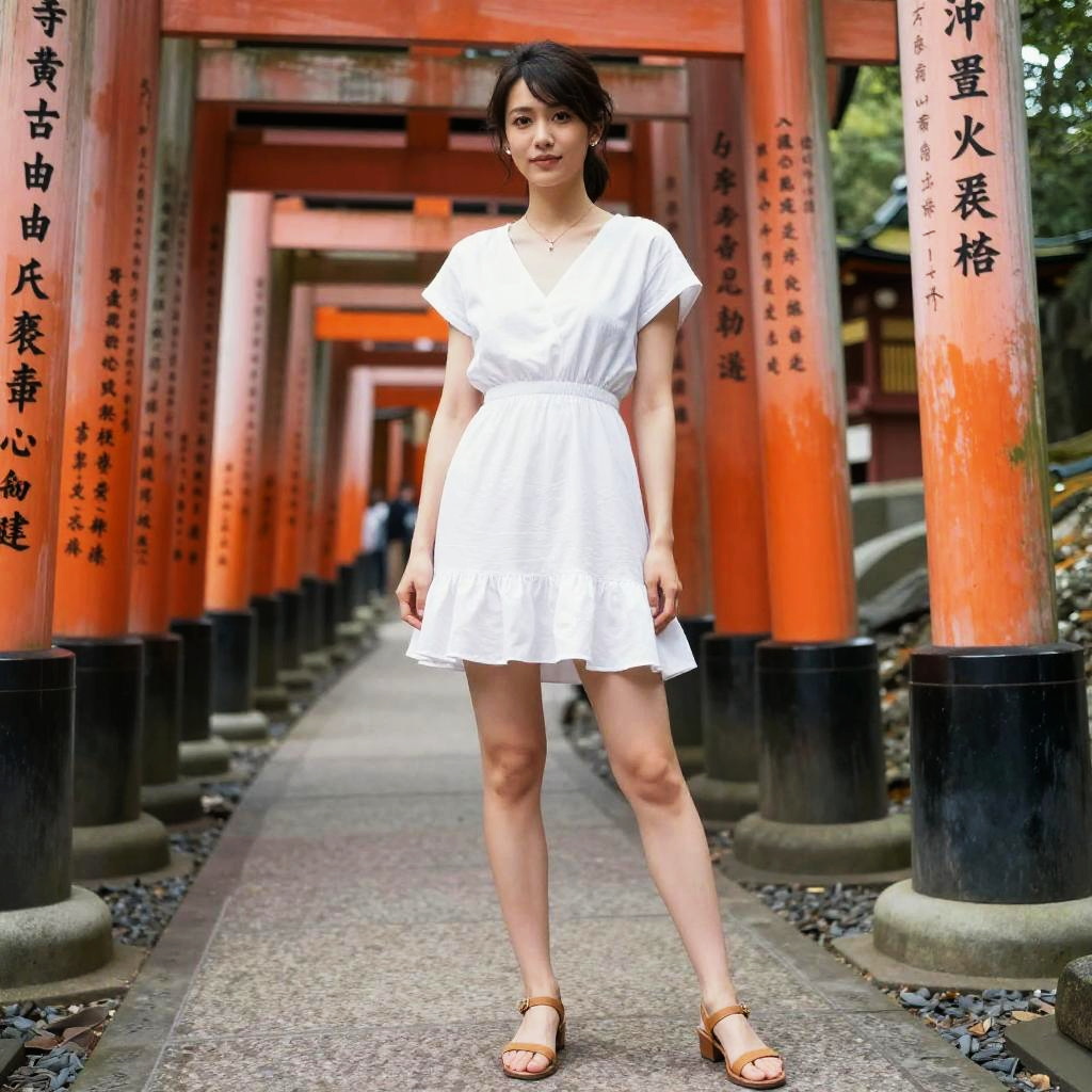 A woman in a casual summer style, wearing a white V-neck mini dress with a ruffle hem and tan strappy sandals, stands gracefully near a temple archway with inscriptions, embodying the vibrant and colorful visual style of Kyoto Animation. Her hair is casually pulled back, complemented by a minimalist necklace and stud earrings. Sexy. Pretty face and beutiful eyes