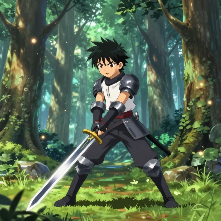 Dark forest anime landscape at night, illuminated by moonlight filtering through dense branches, shadowy creatures lurking, vibrant colors, sharp anime character standing alert