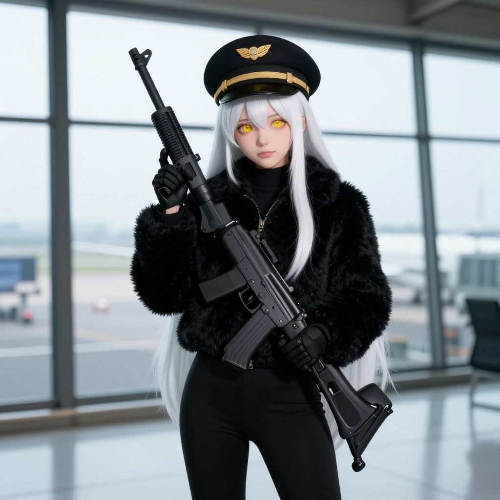 Realistic, ultra detailed, solo, robot, N, happy, black fluffy jacket and black pantolones, away from wiewer, protects wiewer with Uzi, long and large black airport has windows outside is airport and a plane landing backround, pilot hat, yellow shiny eyes, long, white hair, closed mouth, looking wiewer, smooth ligthing, standing
