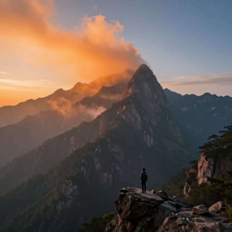Photograph of a lone hiker on a rocky cliff at sunrise, overlooking mist-covered mountain peaks with orange and blue sky.