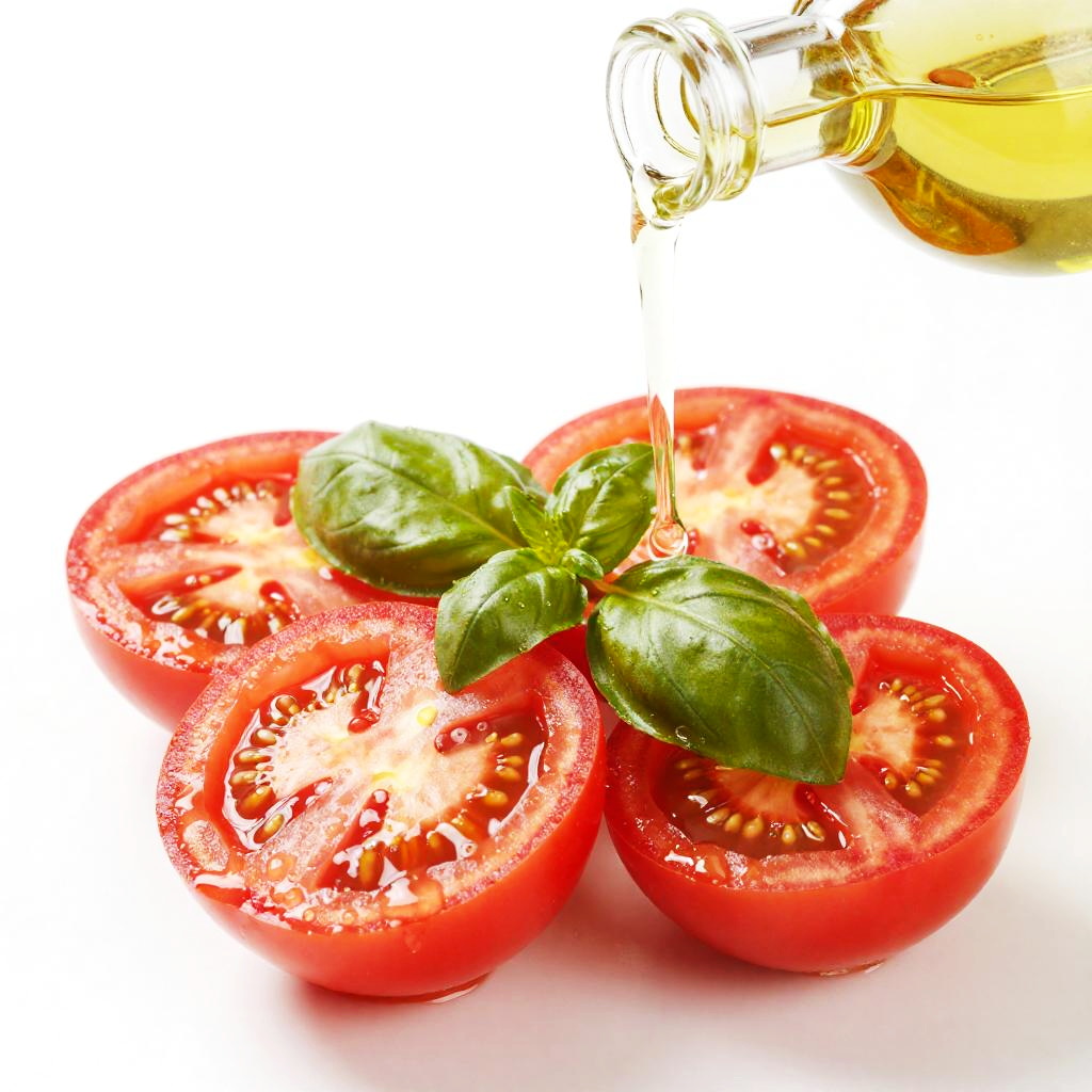 A bright, colorful photo of fresh, juicy tomato halves with vibrant red skin and green basil leaves. A clear glass bottle is pouring clear oil over the tomatoes, creating a shiny, wet effect. The white background makes the colors pop, and the tomatoes and basil are arranged in the center with the bottle positioned at the top right.