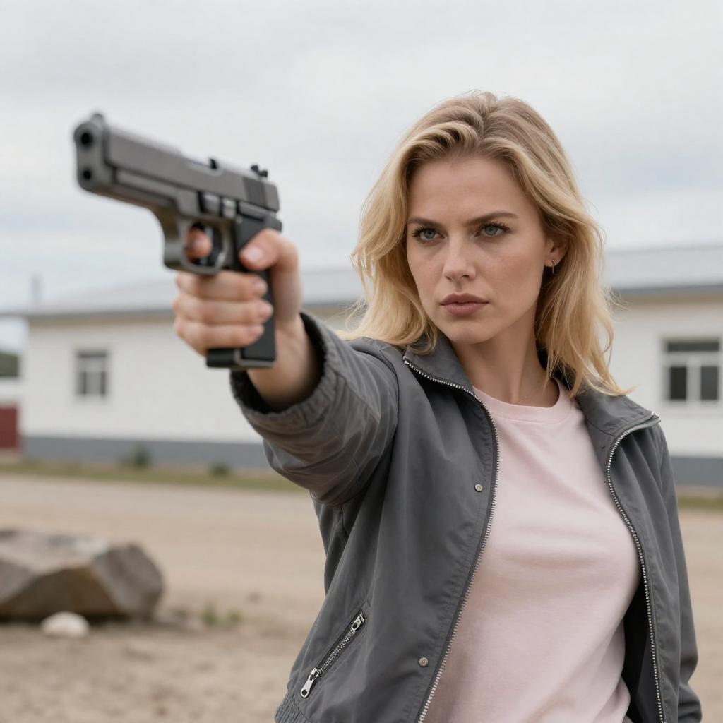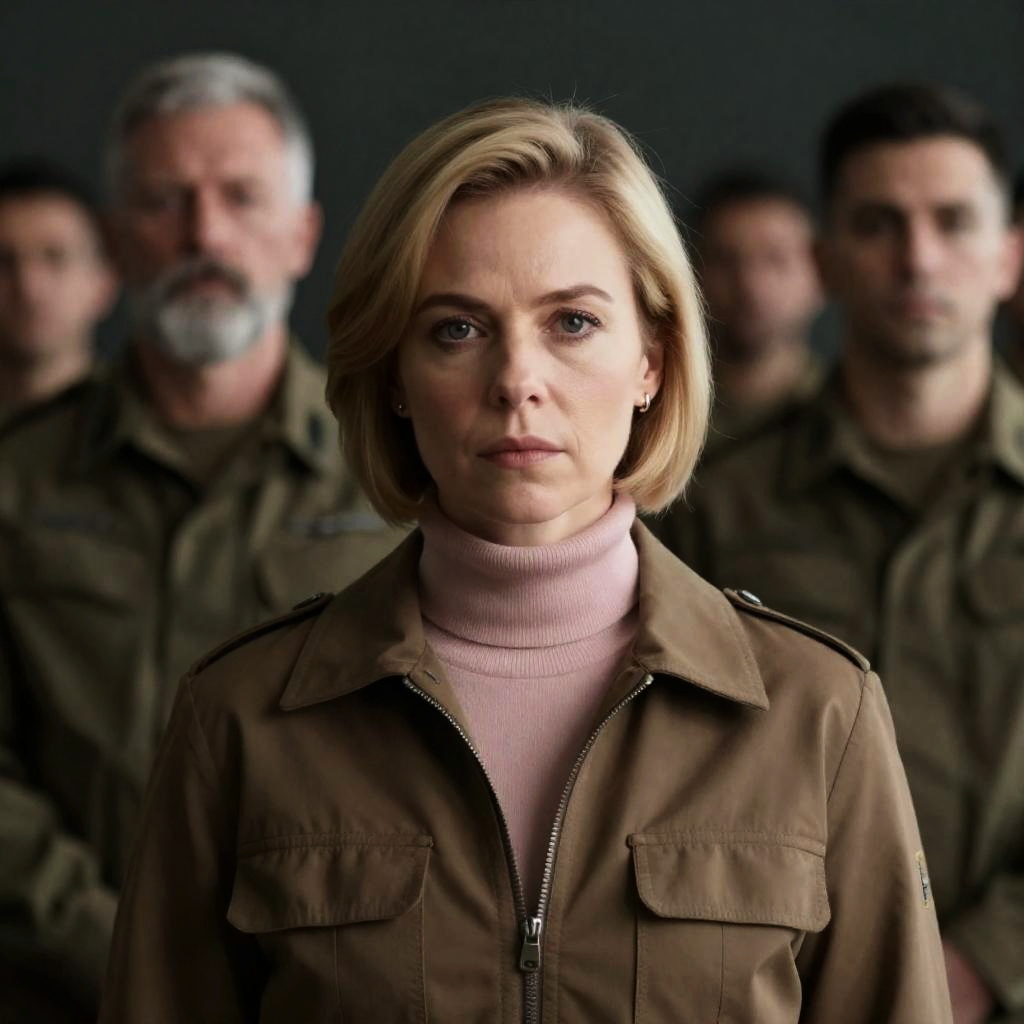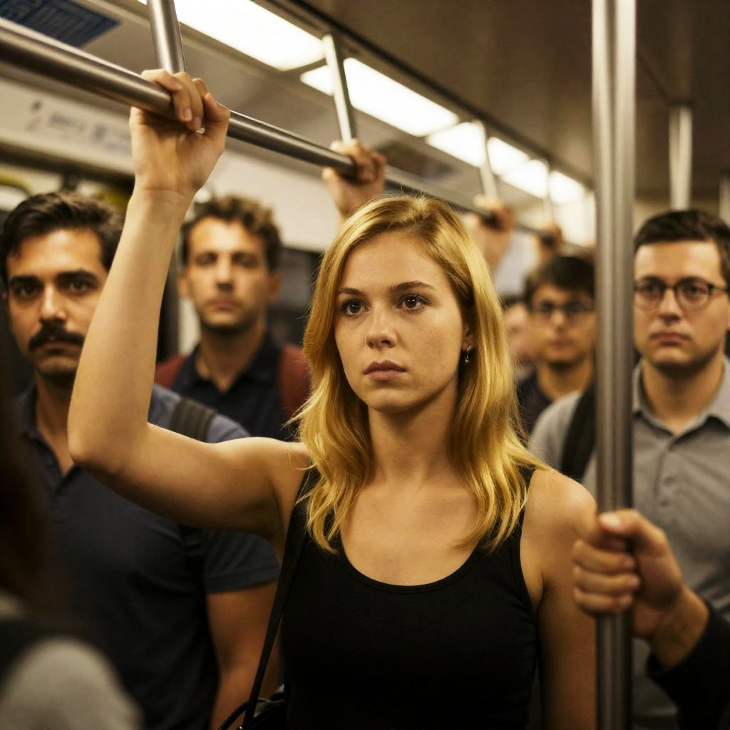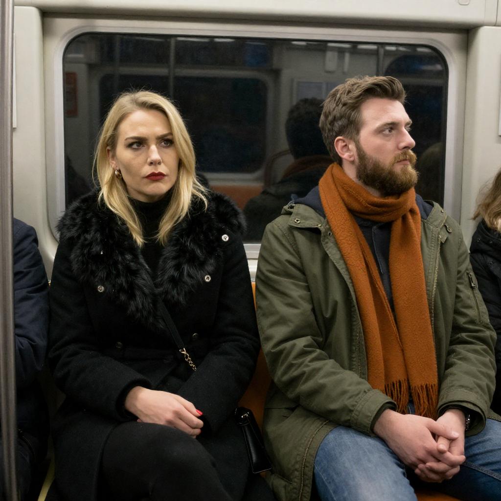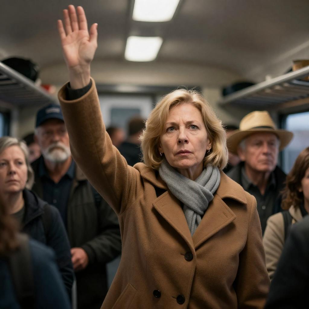 Photograph of a crowded bus. Blonde woman in the foreground, raising her arm, wearing a brown coat and scarf, serious expression. Bearded man in blue hat and glasses behind her, wearing a gray coat. Other people in the background, dim lighting, overhead light.